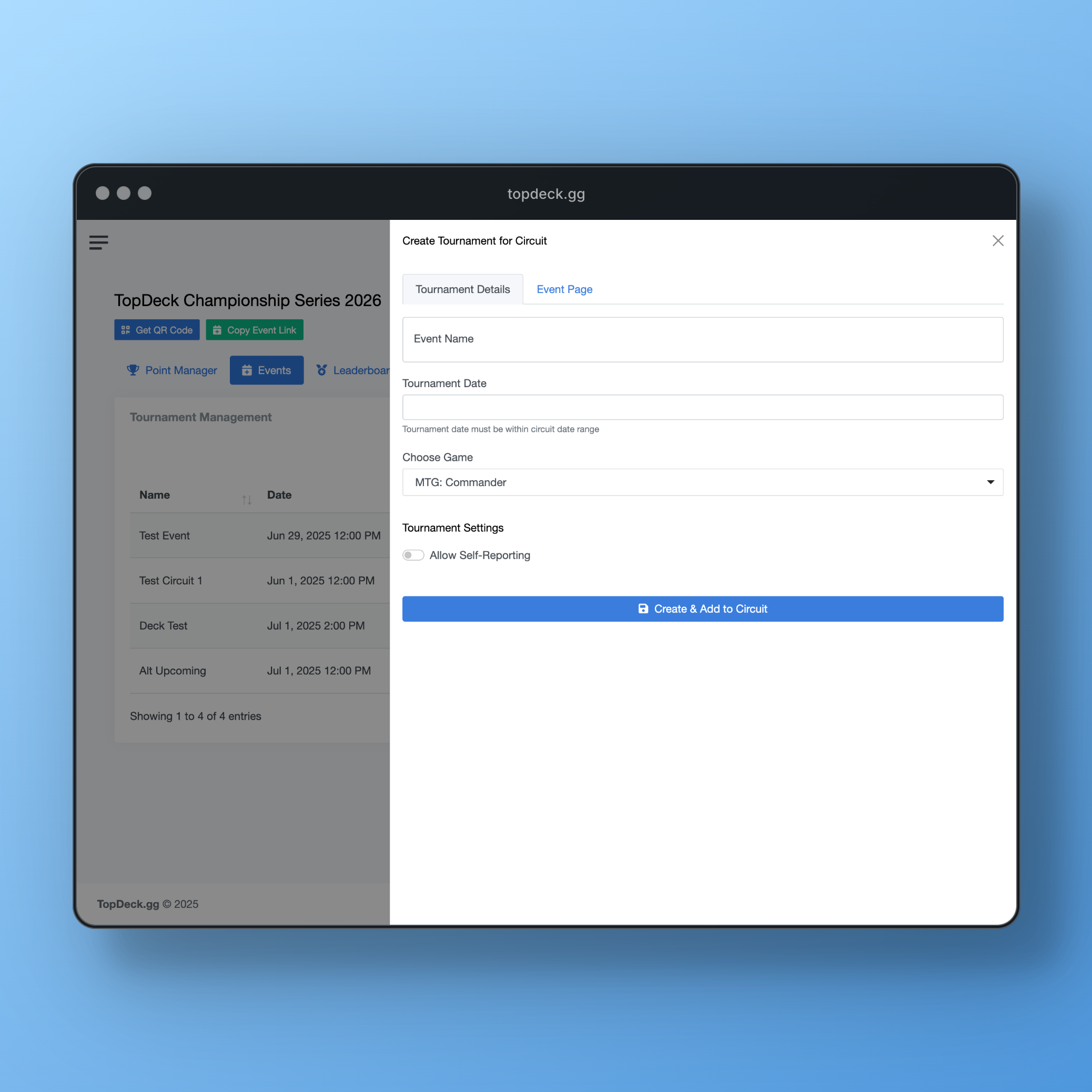 - Create New Tournament: Build tournaments directly within the circuit interface
