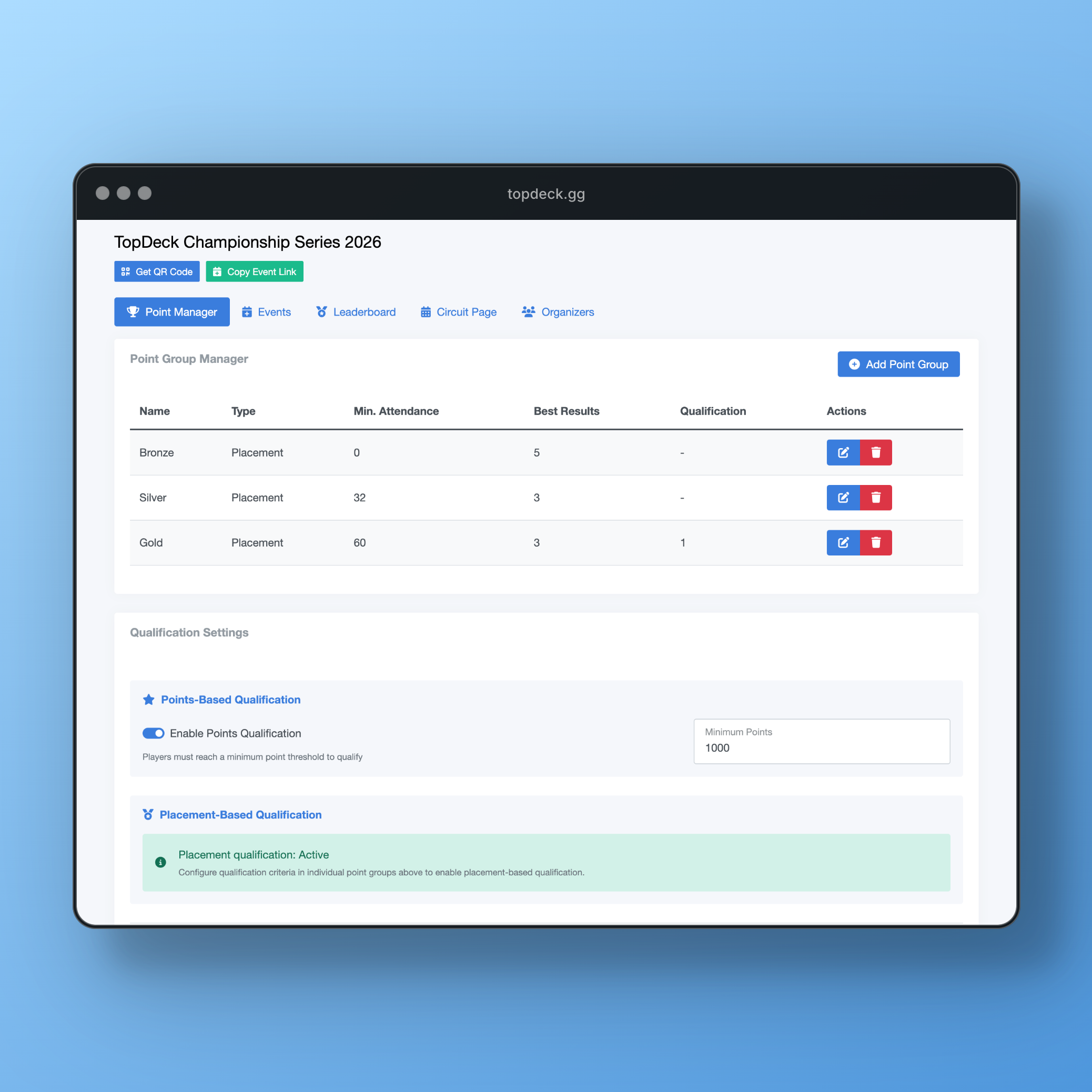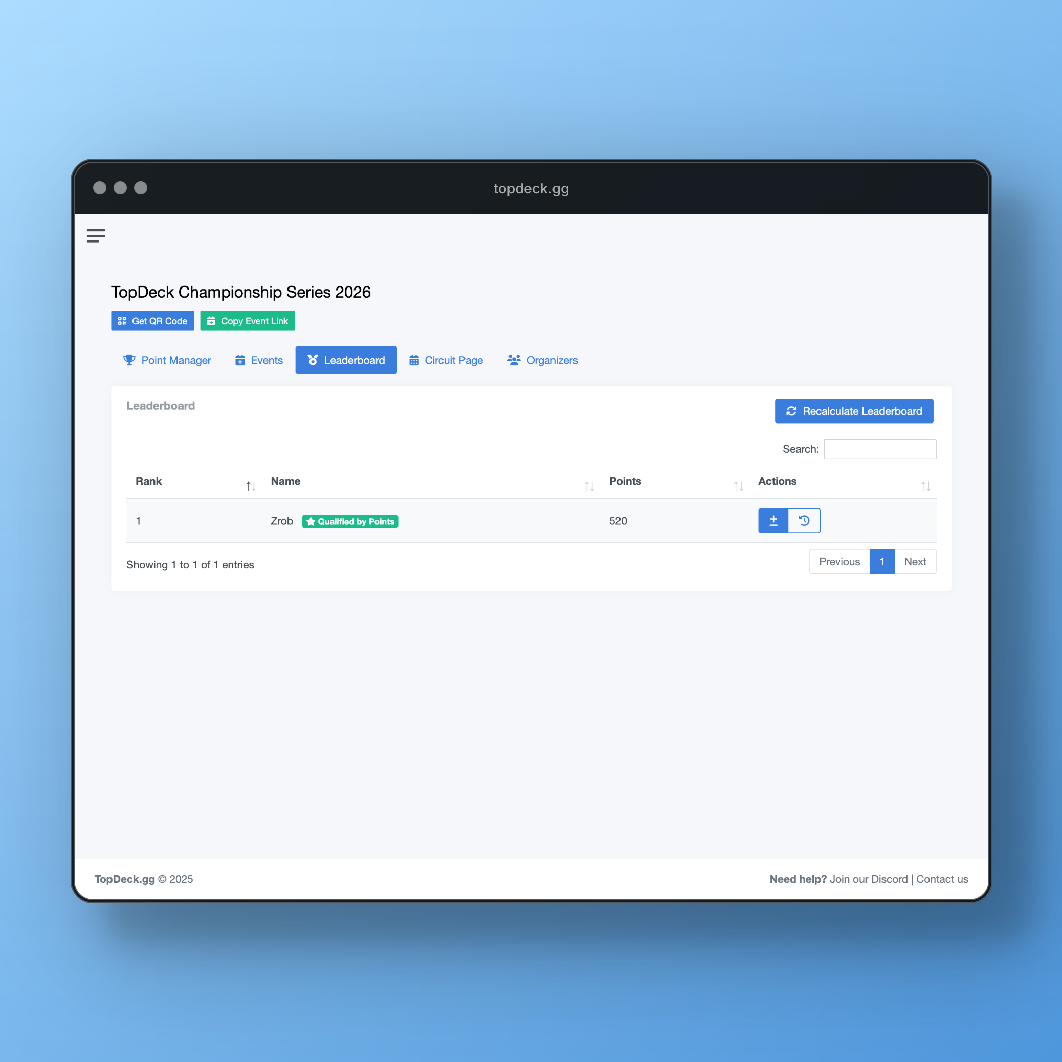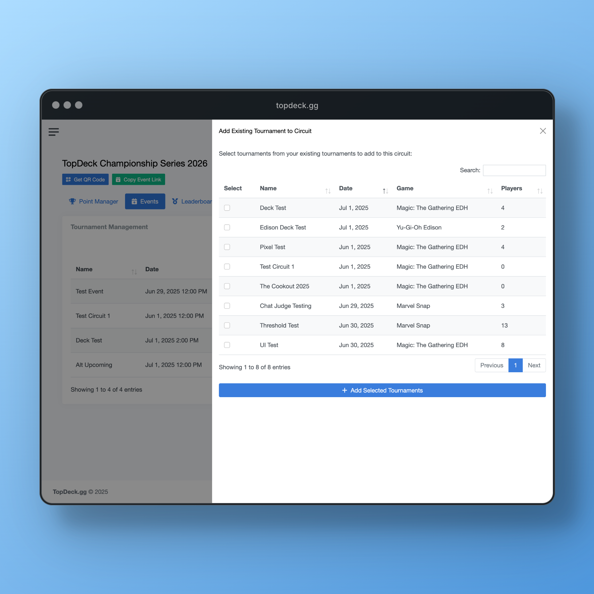 Tournament owners maintain full control over their events while circuit organizers can apply custom point structures and manage the overall series.
