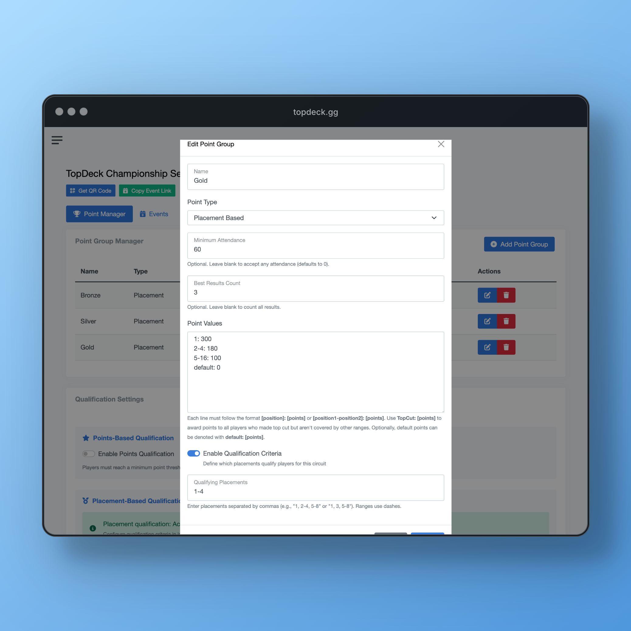 - Define qualifying placements within point groups (e.g., "Top 8 in any Premier event qualifies")