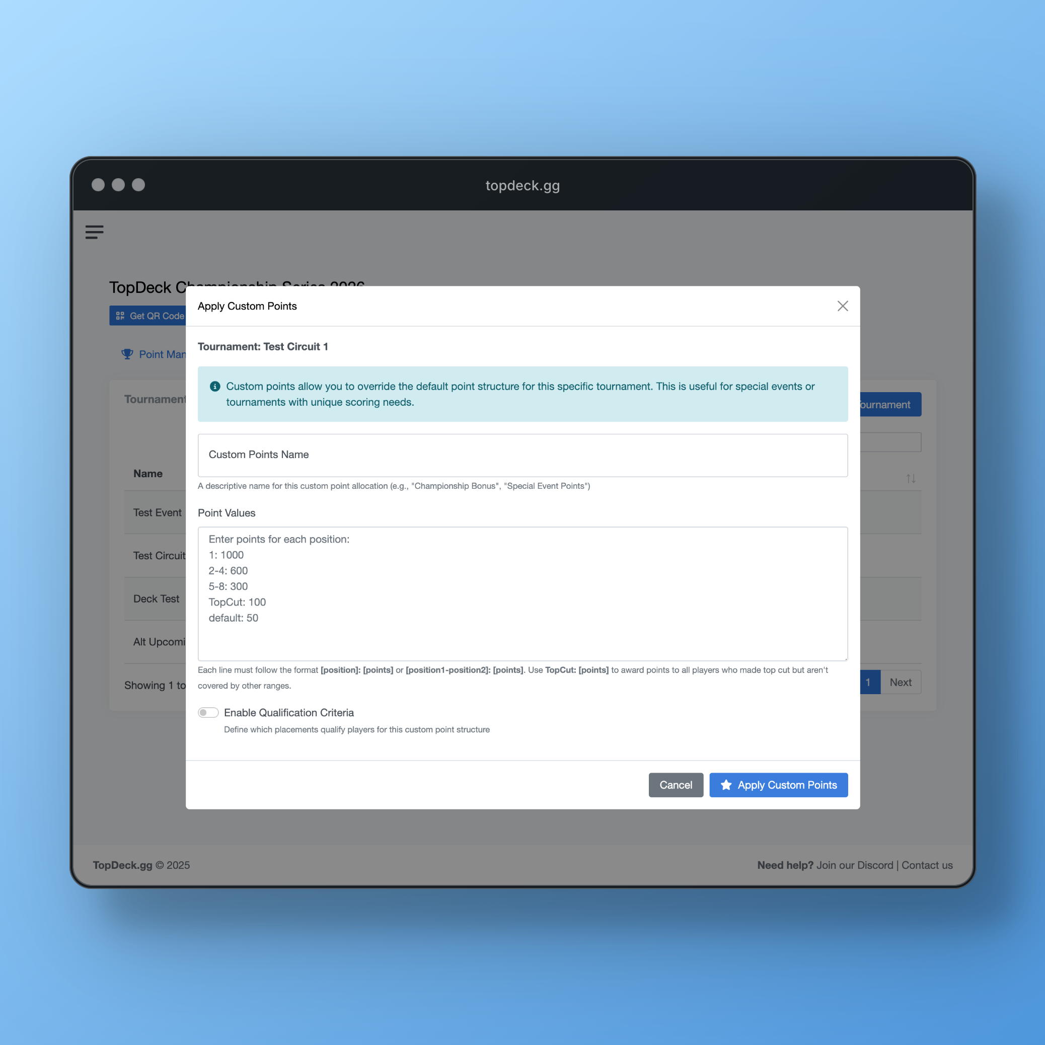 - Placement-Based: Award points based on tournament finish (1st = 10 points, 2nd = 8 points, etc.)