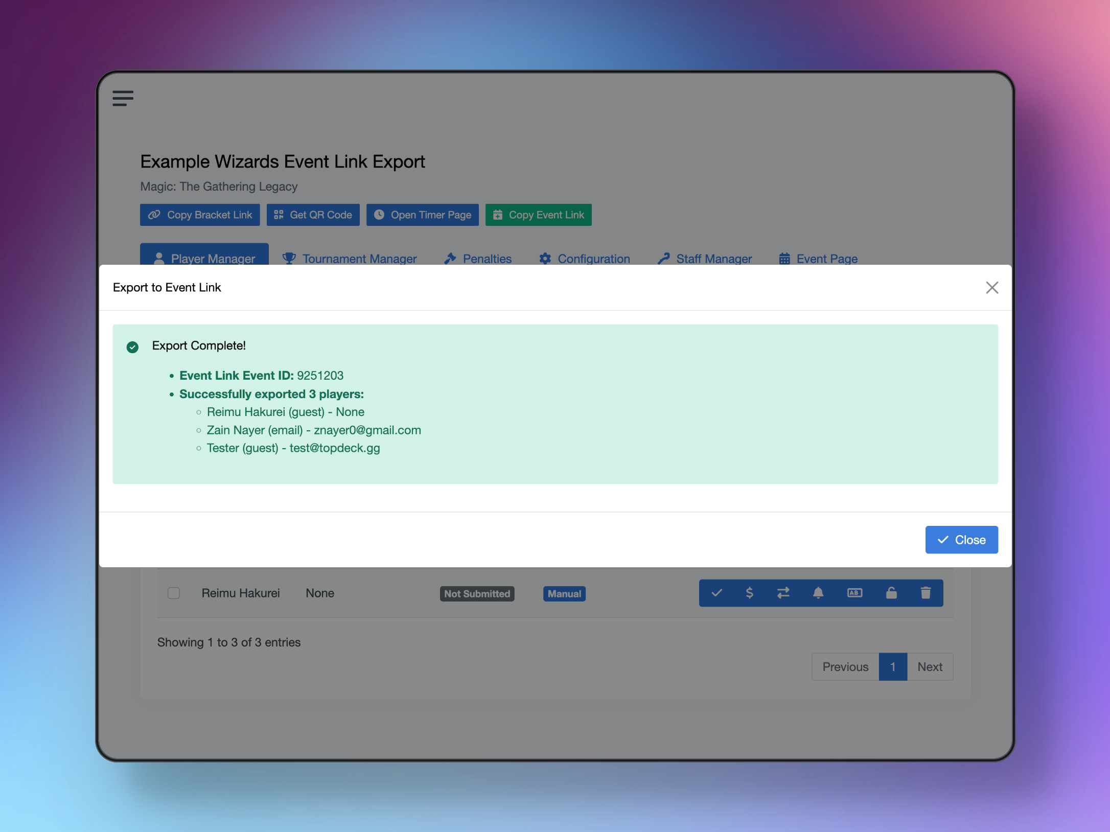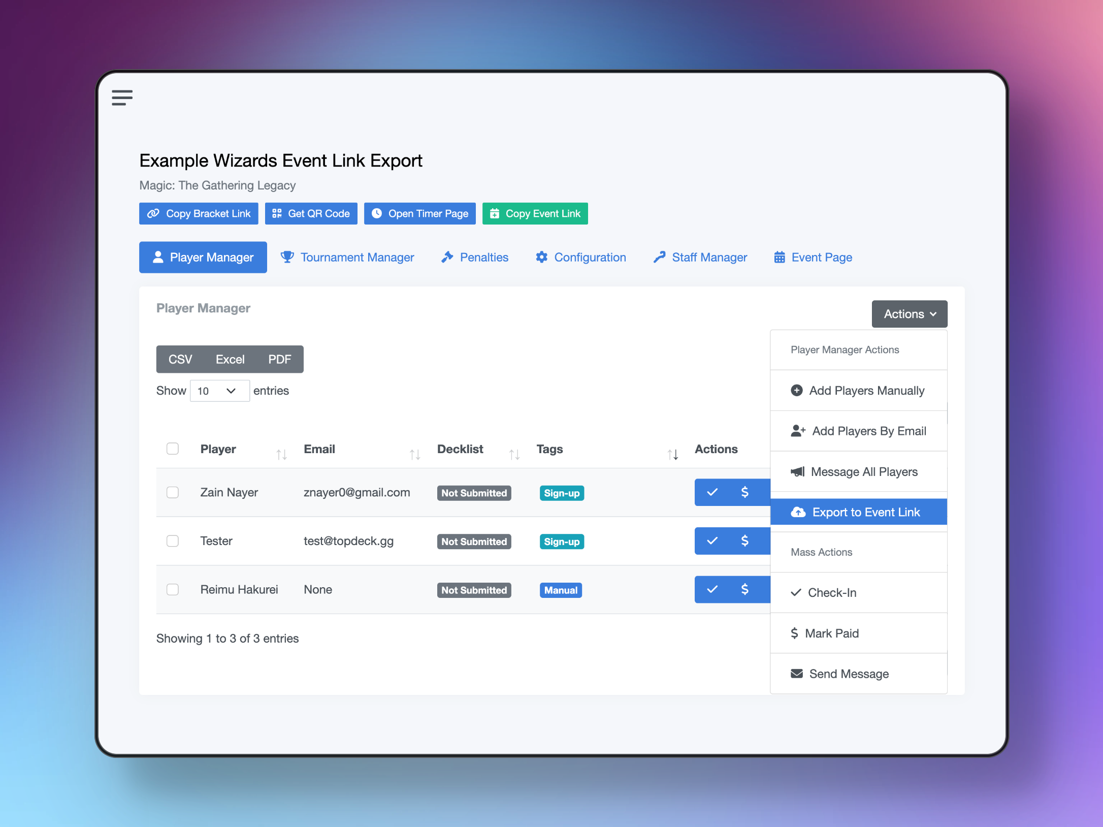 Run prerelease weekends entirely through TopDeck.gg for signups and payments, then export attendee lists to Event Link for official tracking. No more manual data entry.