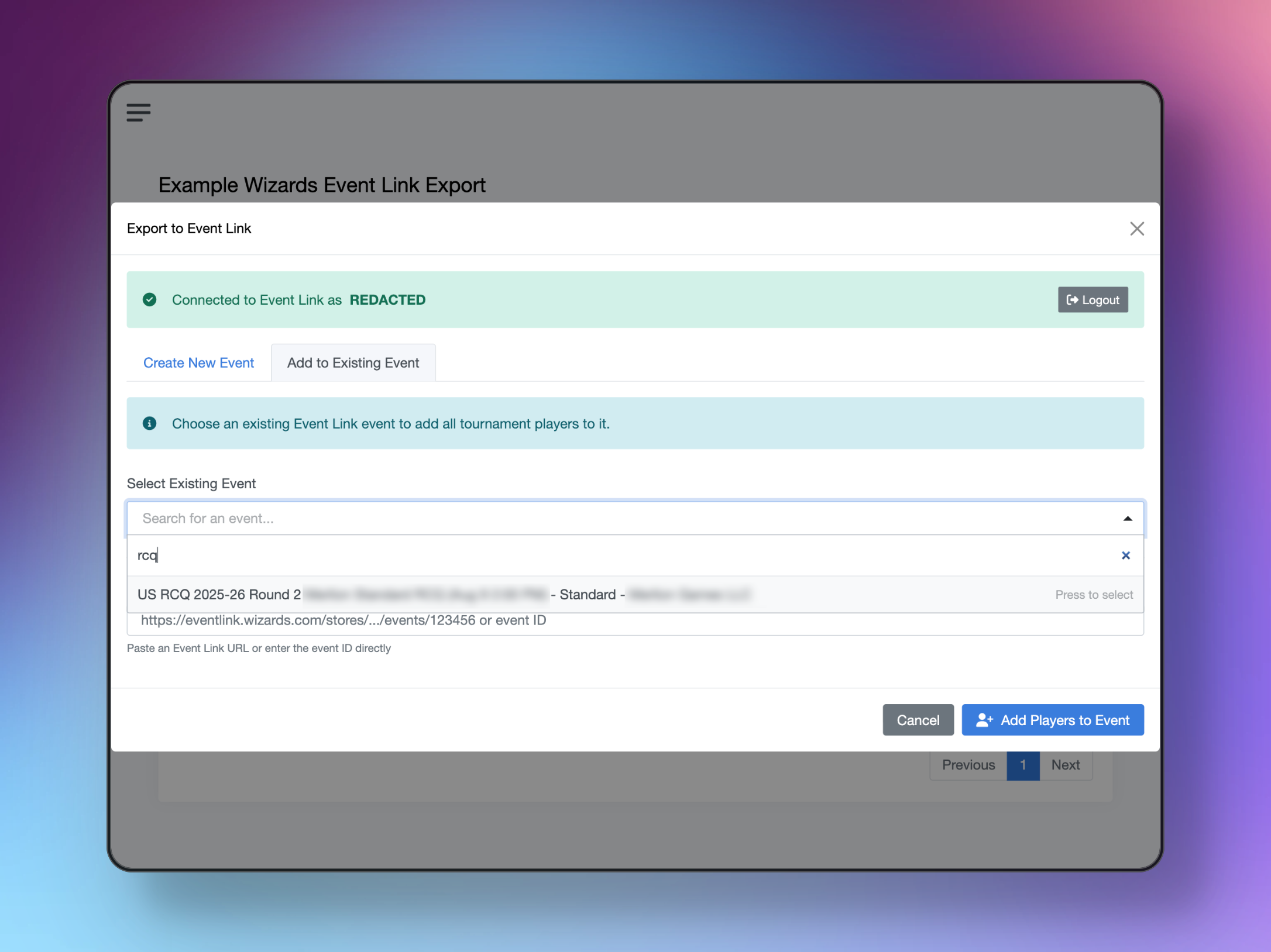 - Look for the "Export to Event Link" option in your tournament dashboard, under the Actions menu
