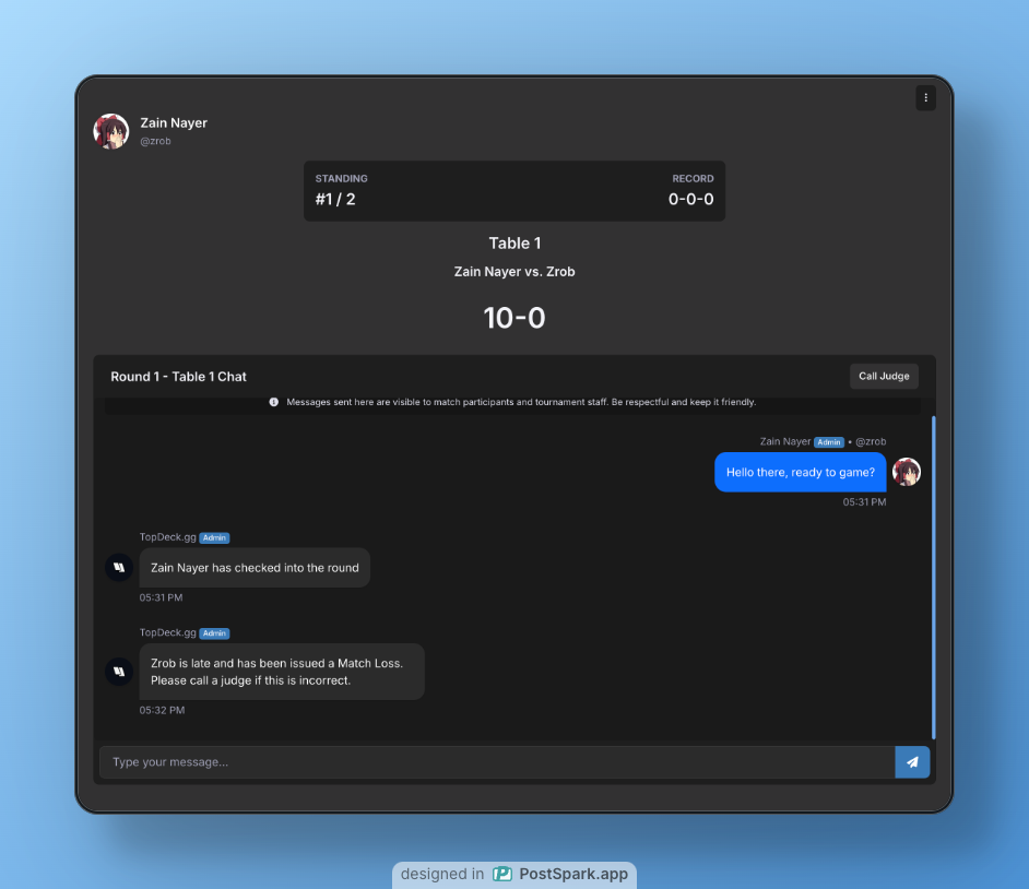 We've integrated an intuitive check-in system directly into match chats: sending a message automatically checks players into their rounds. If a player does not communicate within 5 minutes, they automatically receive a match loss. Players who fail to check in for a round entirely will be dropped at the round's conclusion. This dramatically streamlines tournament operations, minimizing administrative headaches and unnecessary judge interventions.