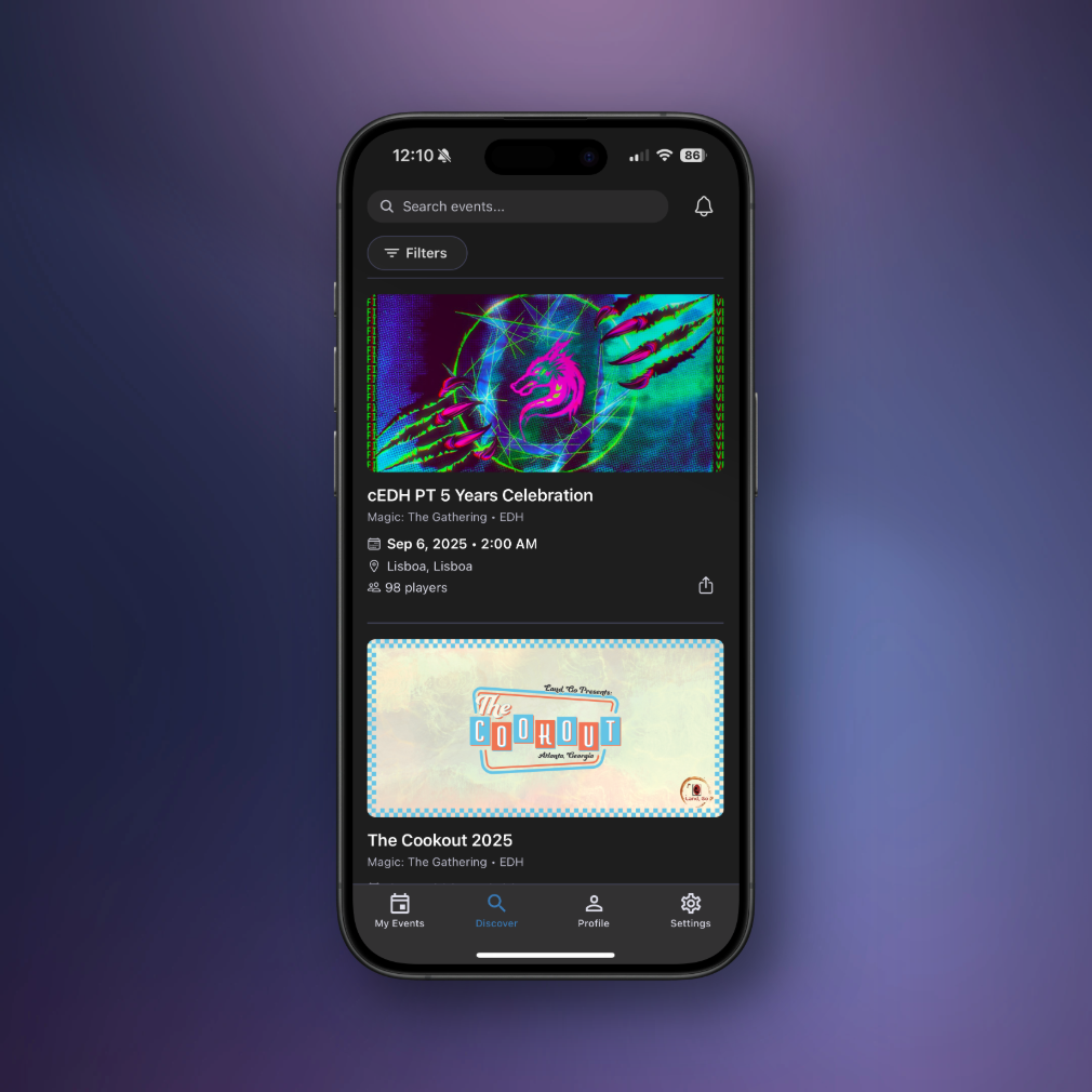 Finding your next event has never been easier. The discover screen shows upcoming tournaments filtered by your location, preferred games, and followed stores.