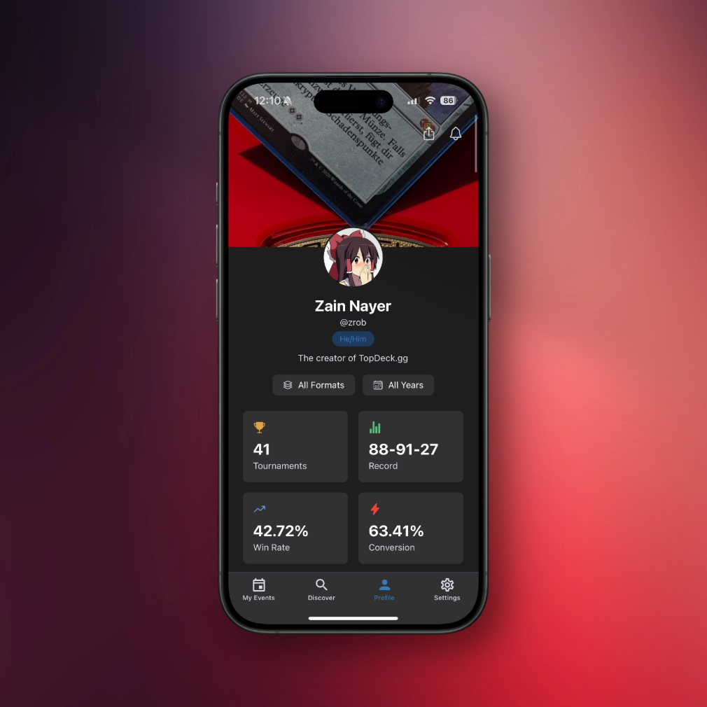 Your complete TopDeck profile is now fully native. Track stats, achievements, tournament history, all lightning fast, with no web views.