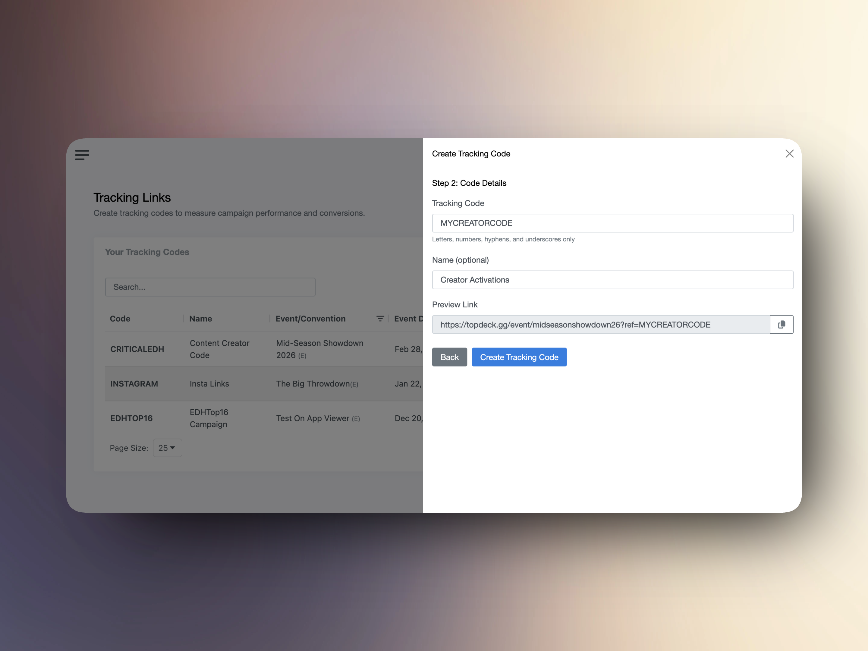 Head to Tracking Links in your organizer tools. You'll see all your events and conventions ready for tracking.