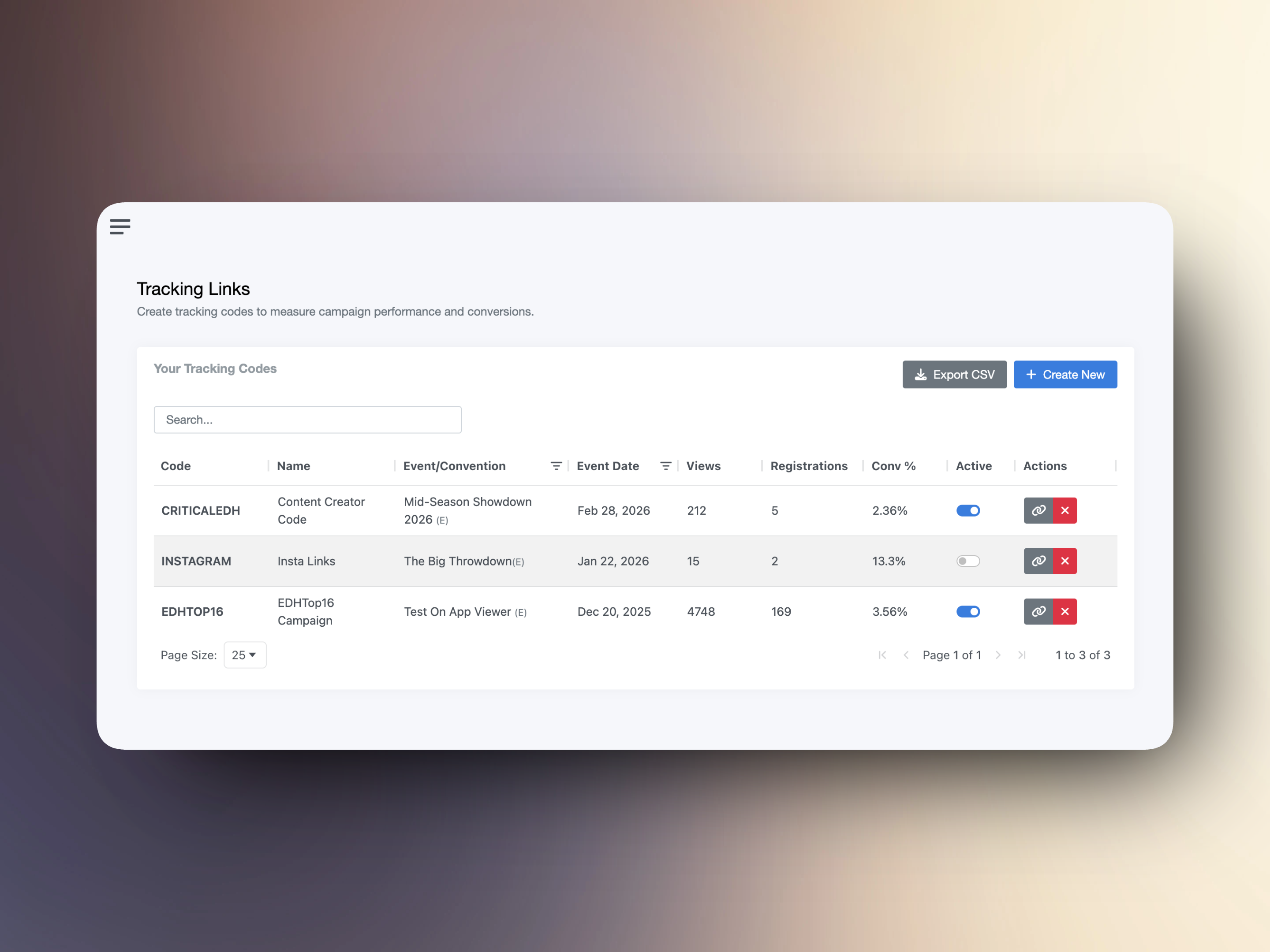 Tracking Links lets you create unique codes for your events and conventions, then see exactly how many people clicked and how many registered.