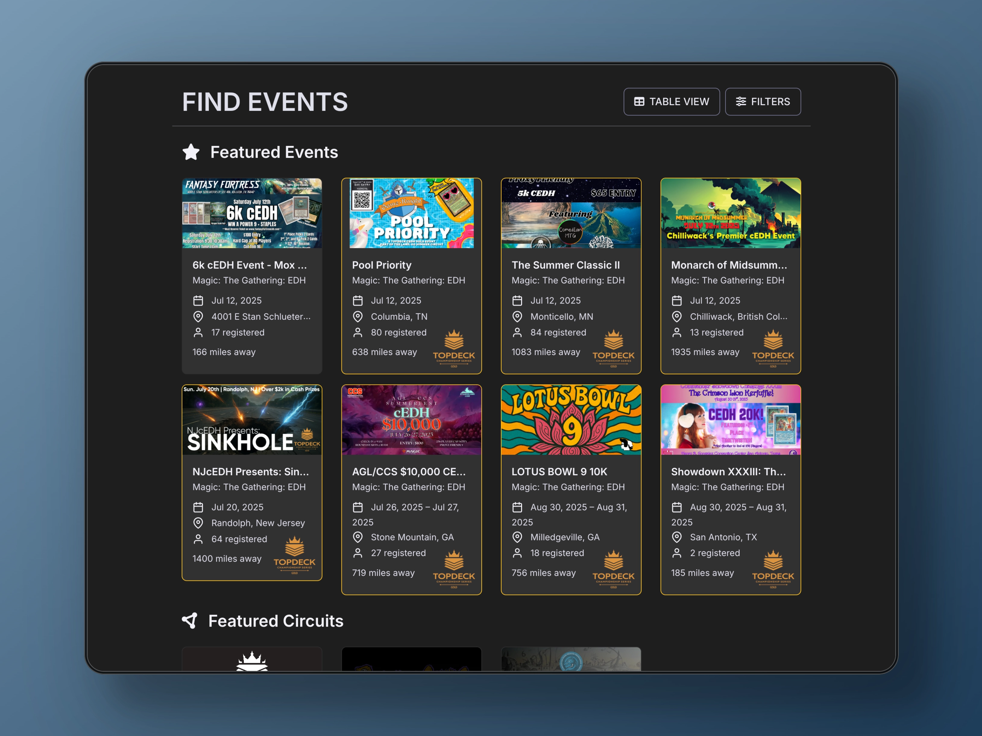 Your TCG tournaments appear on TopDeck.gg where 150,000+ players search for local game store events by location and format.