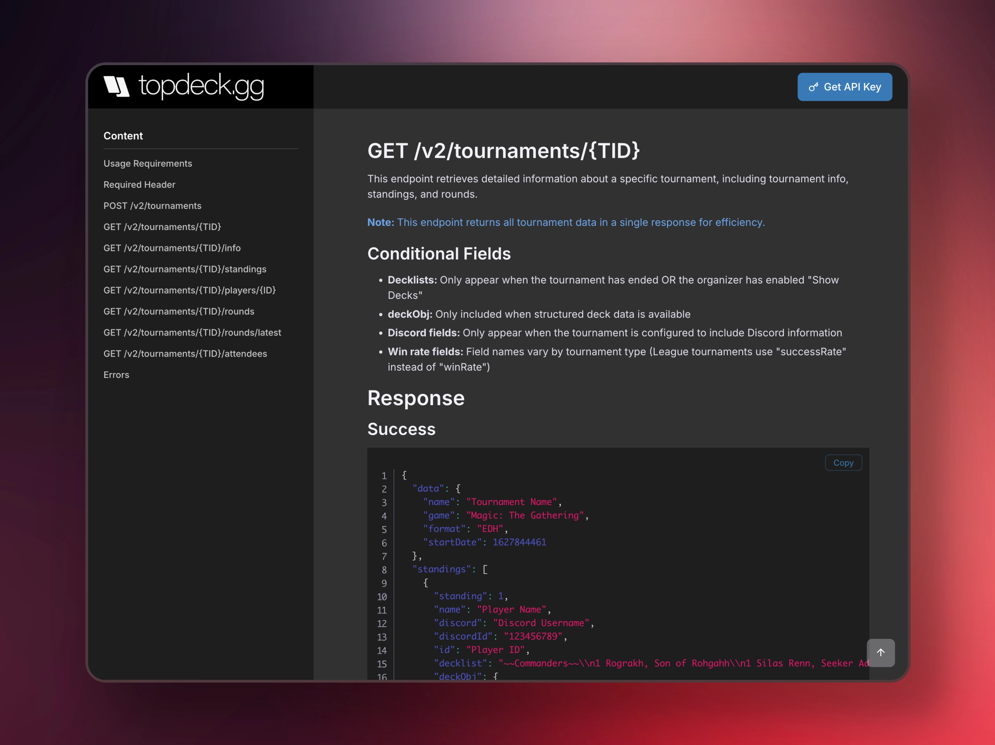 Full REST API access to TCG tournaments, players, standings, pairings, and results. Build any Magic tournament software integration you can imagine.