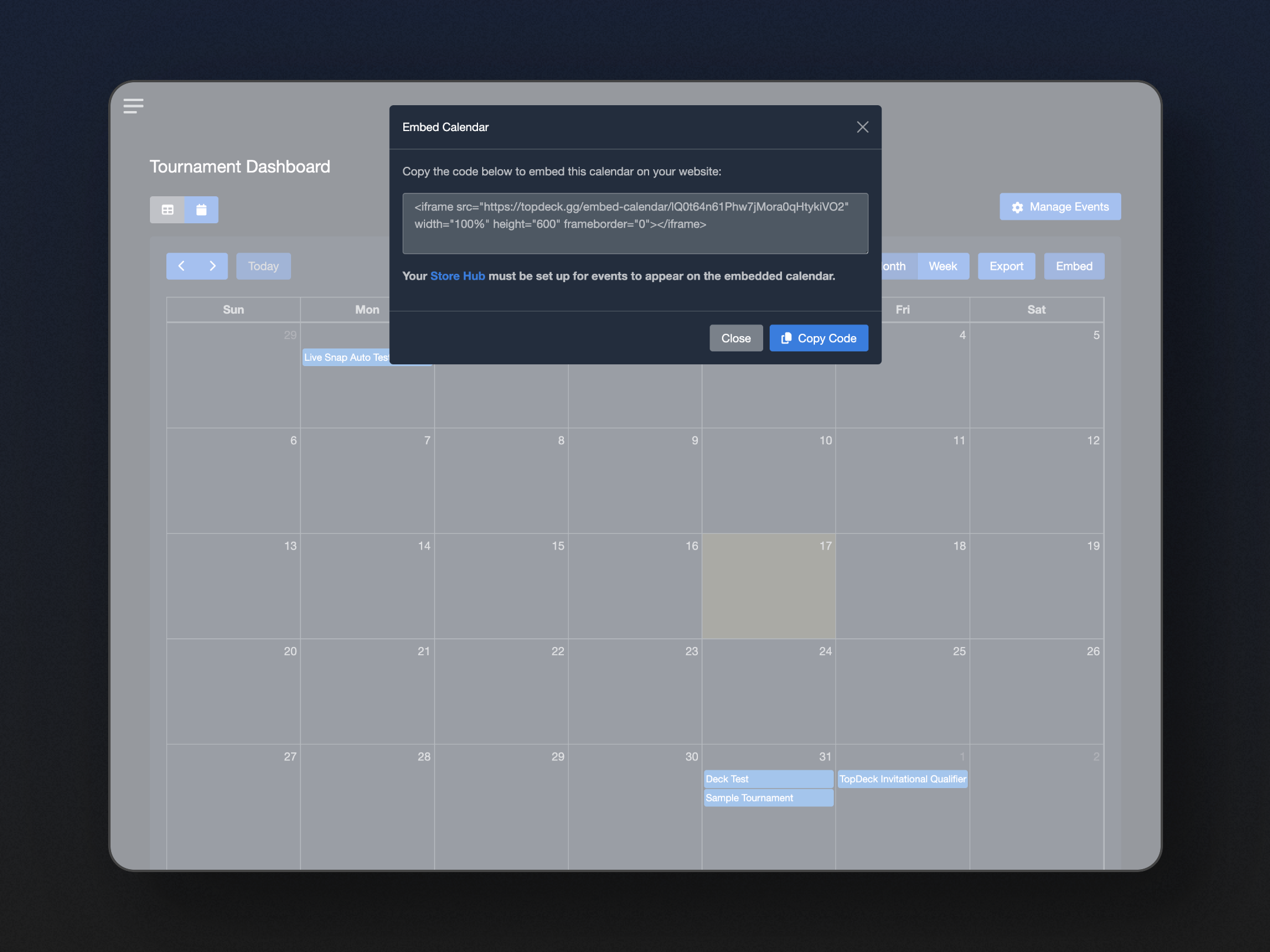 You can click the Embed button to get a code to place on your website, embedding your tournament calendar on your webpage. This calendar stays up to date as you add and create new tournaments, circuits, and more.
