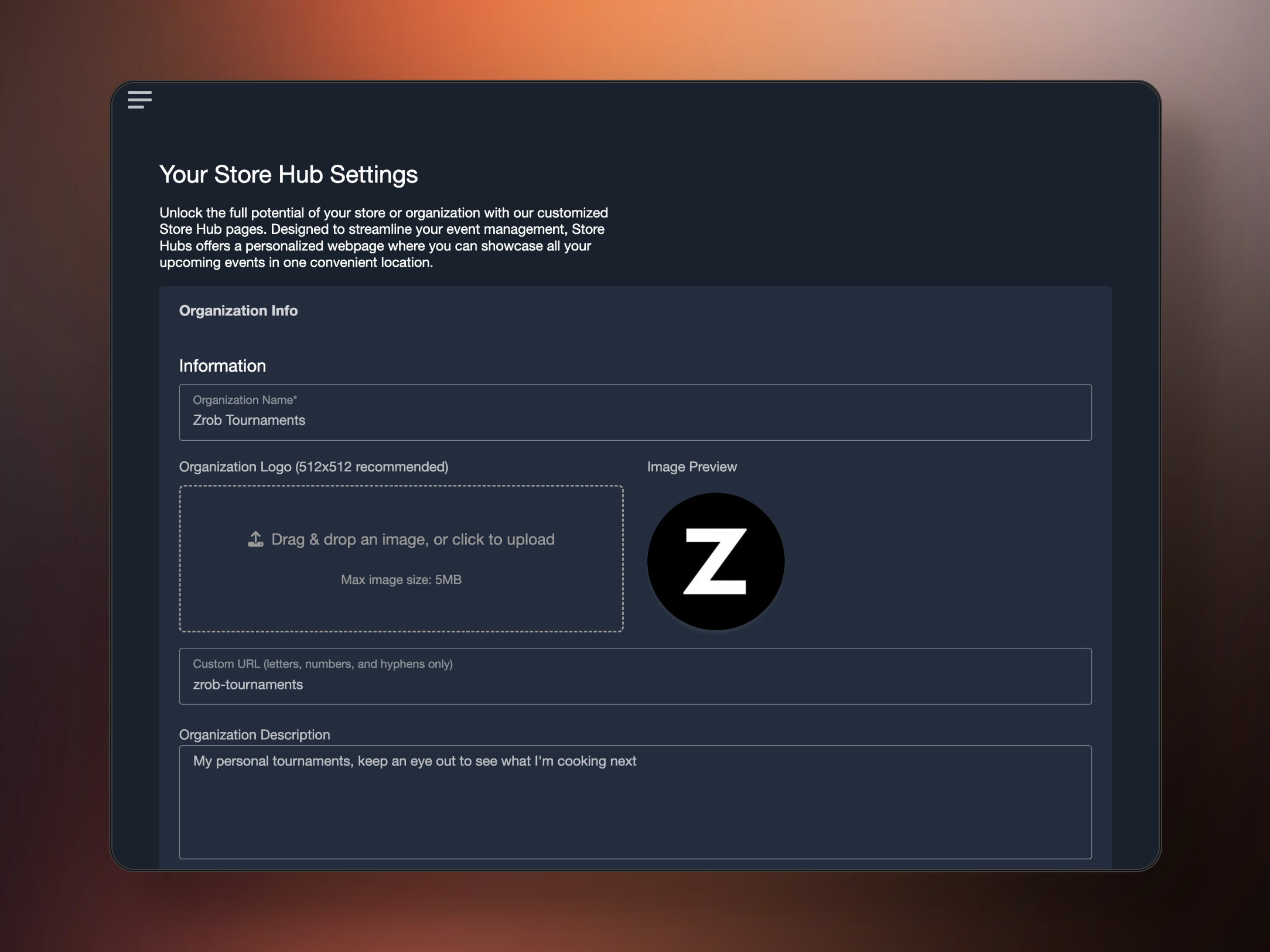 To create your store hub, navigate to the Store Hub page from the sidebar on the tournament dashboard.