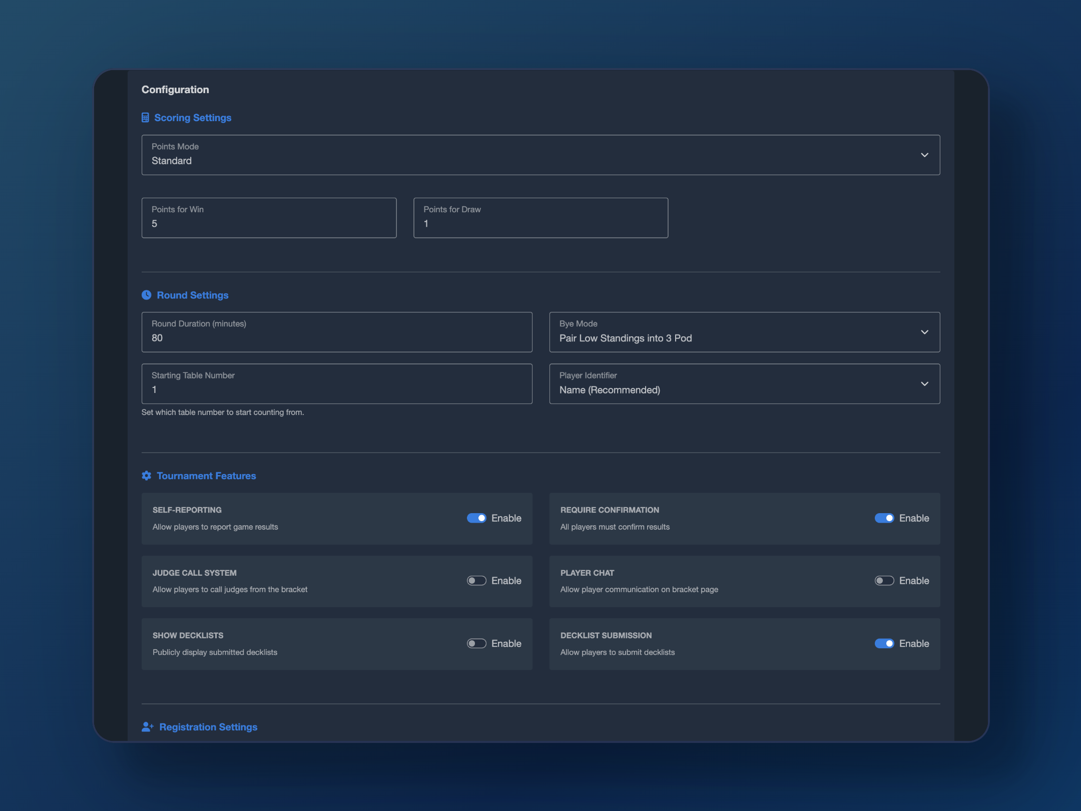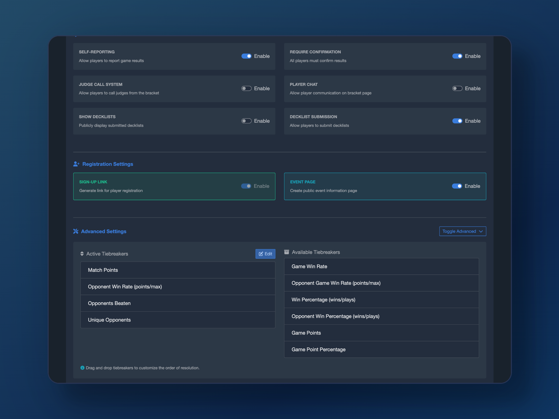 - Require Confirmation: If Self-Reporting is toggled on, set this to require confirmation from all players on the reported result.