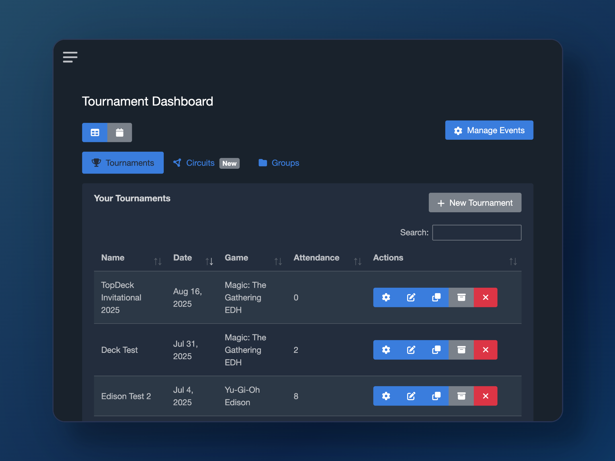 Creating a tournament on TopDeck.gg is a straightforward process designed to be quick and user-friendly. You'll start by entering a few basic details; later you can modify these or view more advanced options within th tournament manager itself.