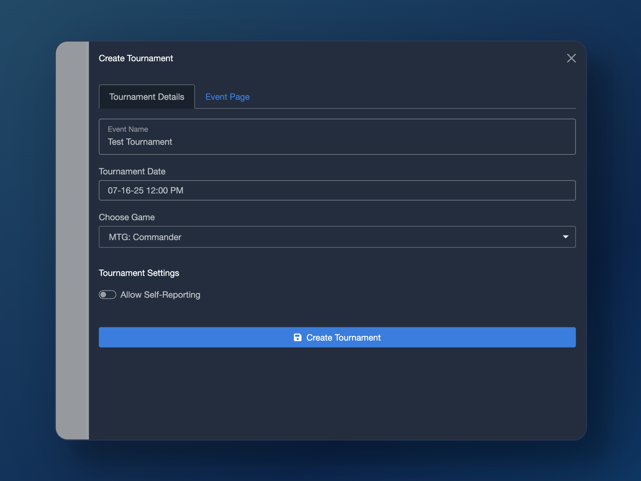 Once on configuration screen, you'll need to enter a name (longer than 3 characters), date and time, and select a game/format from the dropdown. You can also quick enable self reporting.