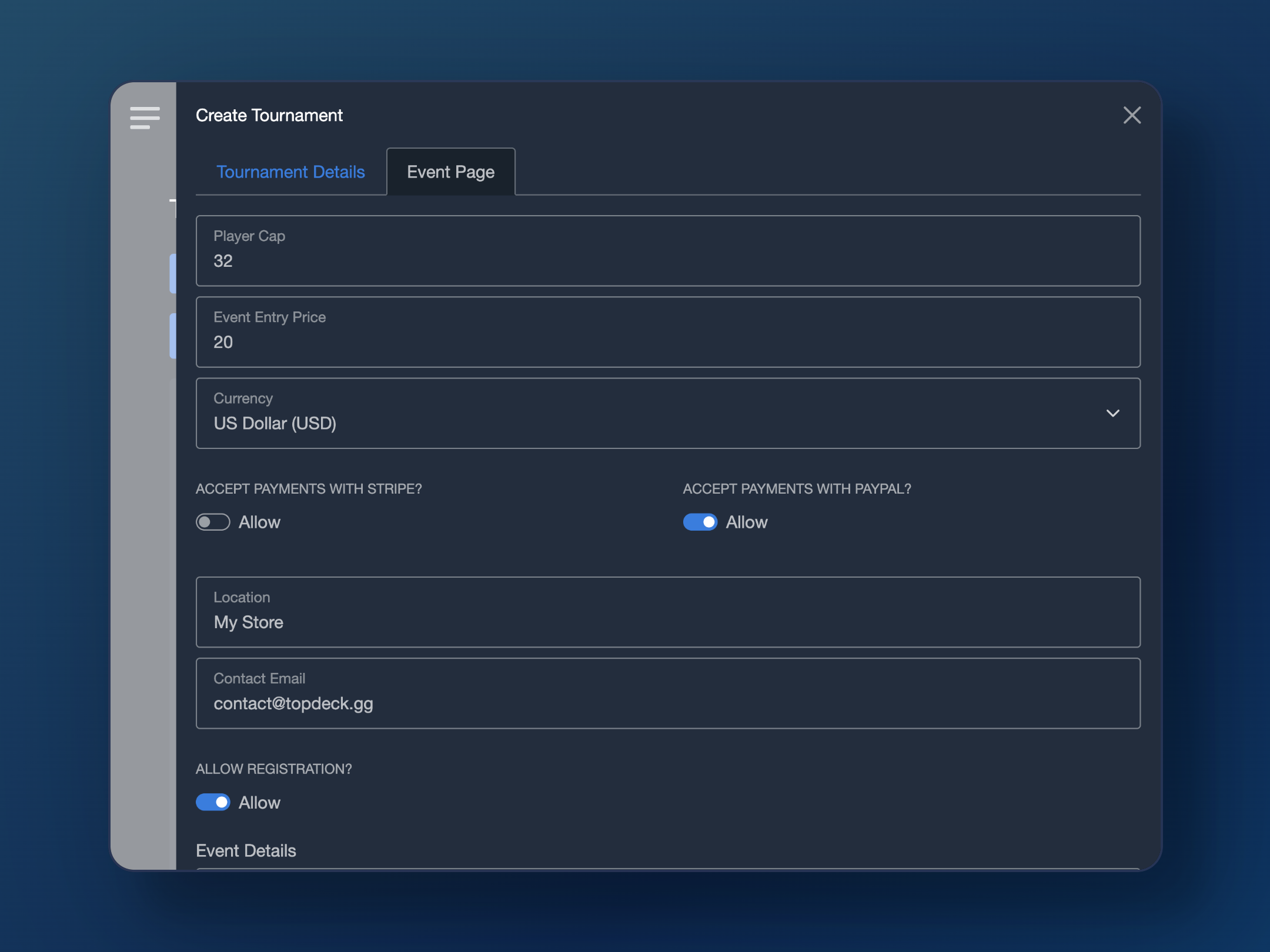 - Event Page: Allows you to create an event page with event details, pricing, and more. Players can register from the page. More details on this in Creating Event Pages.