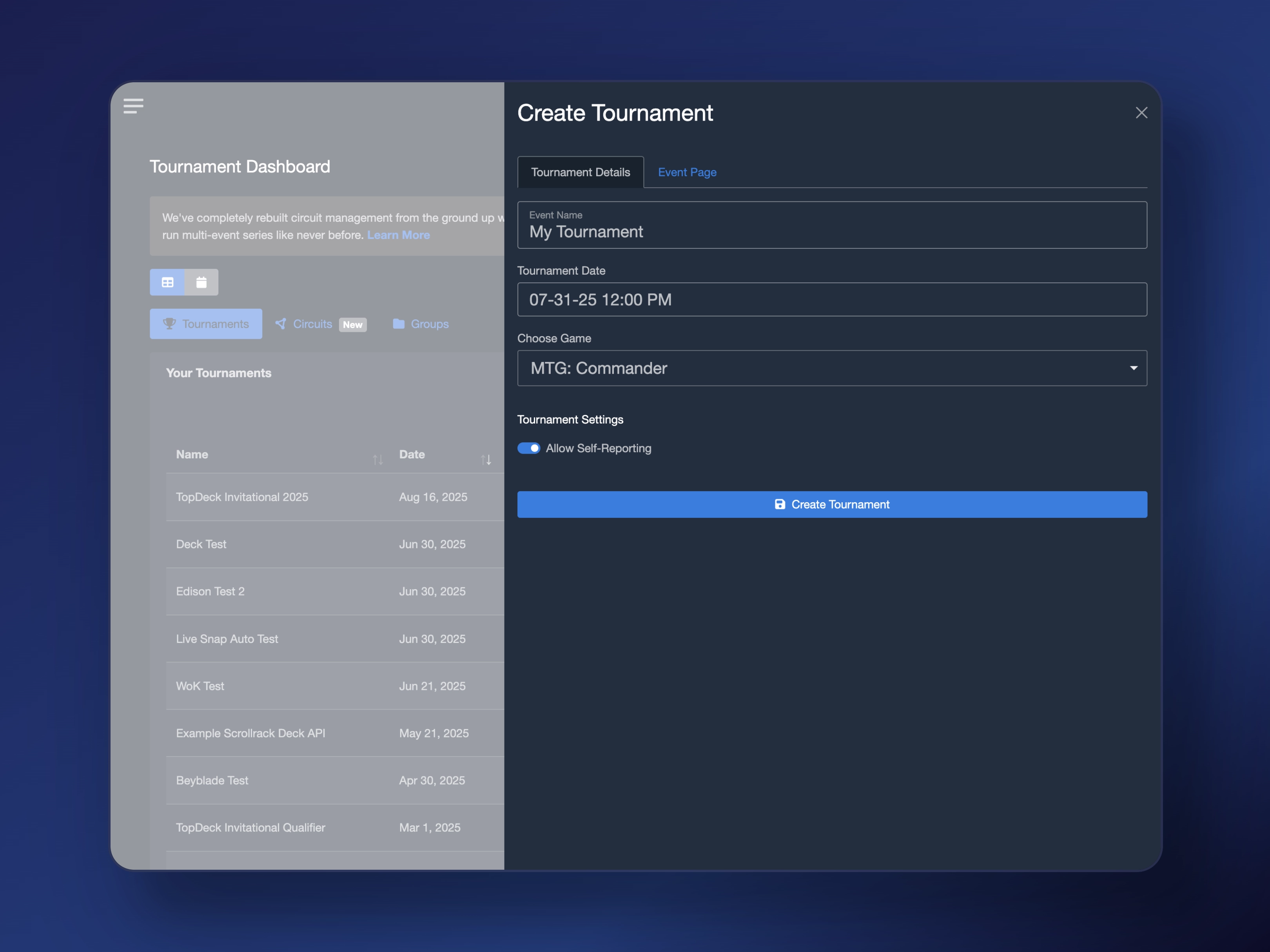 Once you're on the tournament dashboard, click New Tournament in the Tournaments tab. This will bring out a menu where you can set basic things like tournament date, start date, and game/format.
