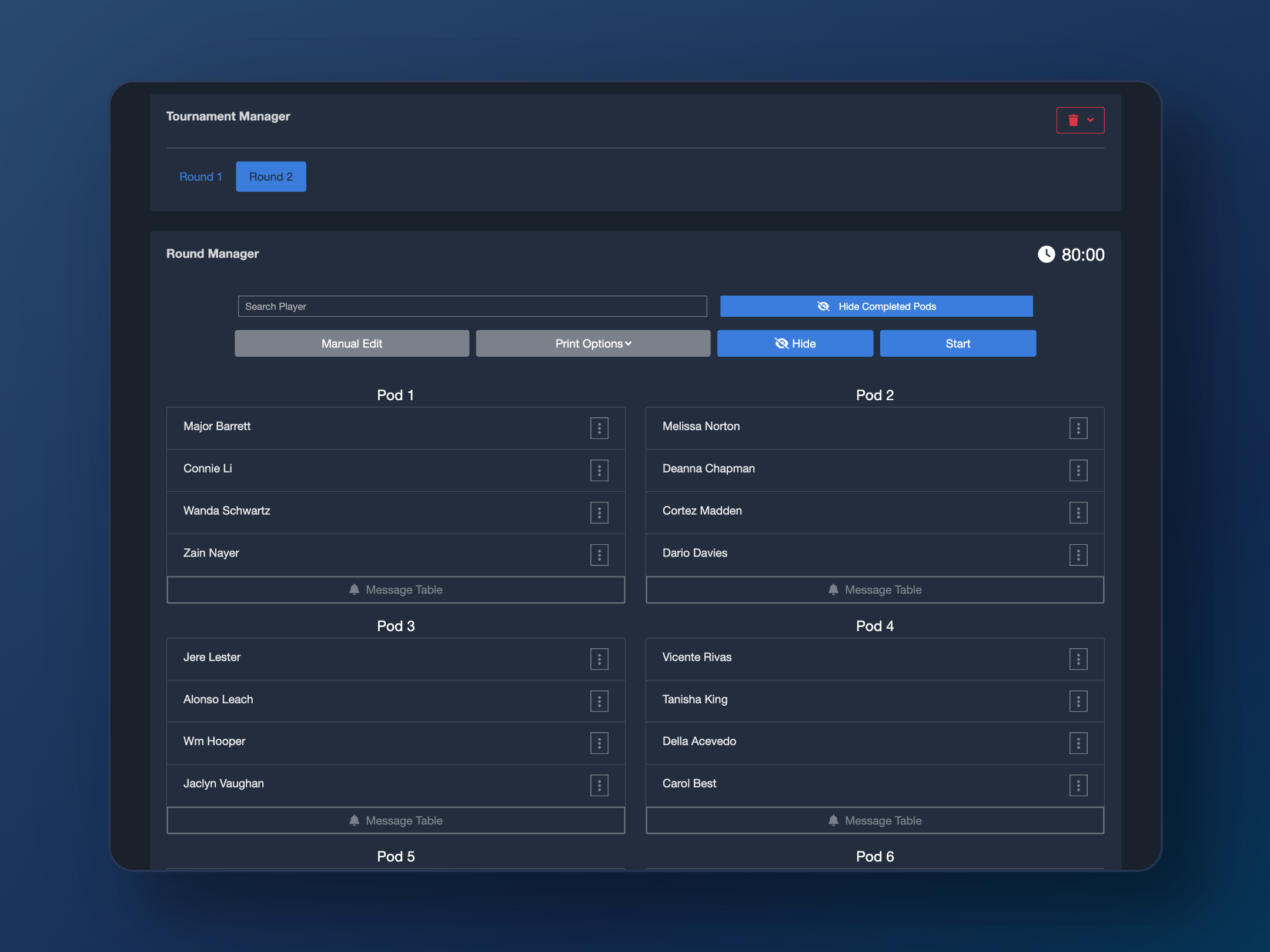 Once you've registered your players, navigate to the Tournament Manager. There you will find a list of standings and actions for players, like dropping them or assigning byes.