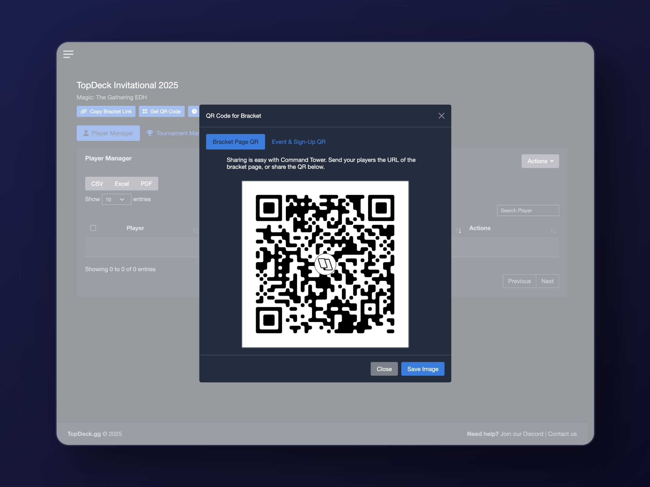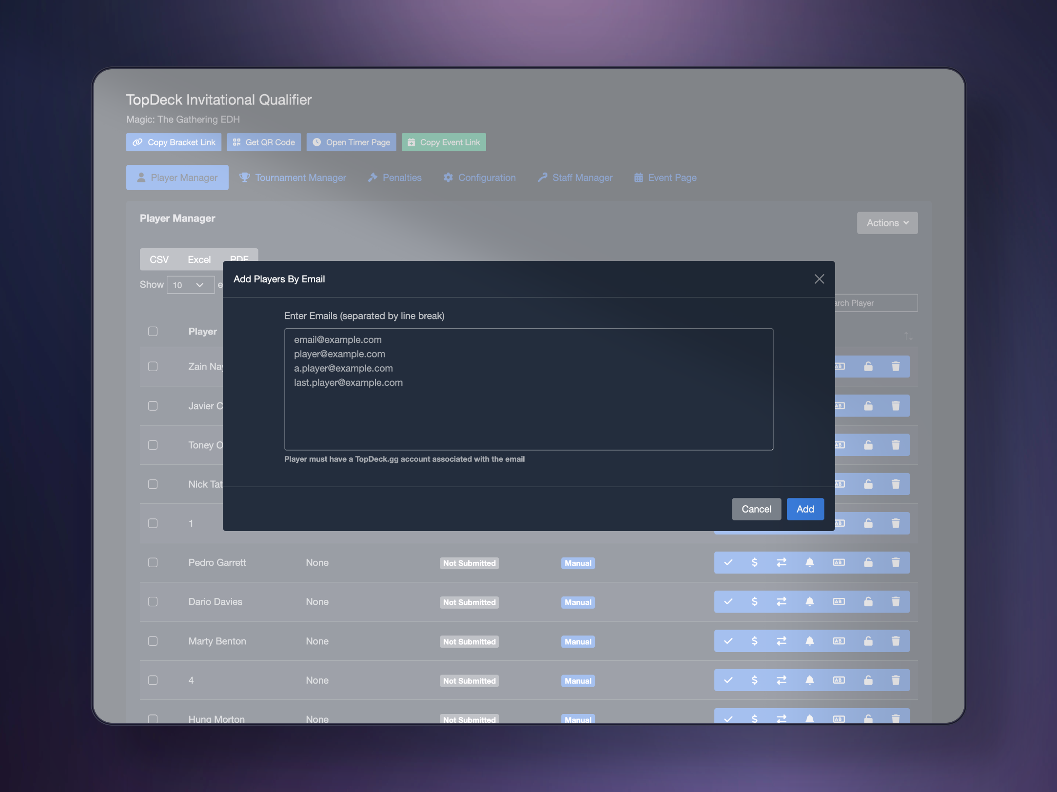 Note that manually added players have very limited ways to interact with TopDeck.gg. They will be unable to check in, submit decks, see the bracket from the mobile app, and you won't be able to do things like message them. We highly recommend that players have TopDeck.gg accounts and register for events with those accounts.