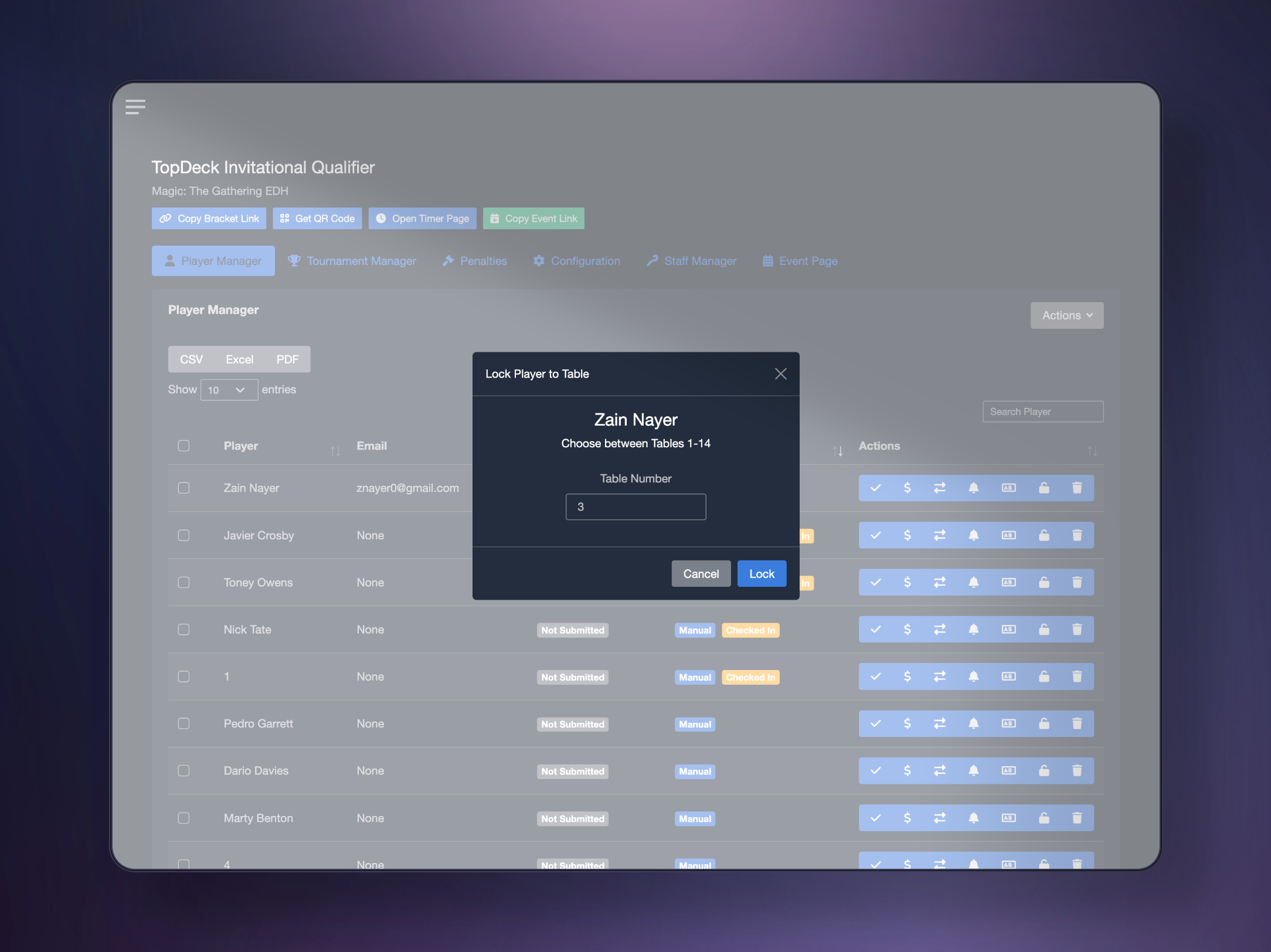 In this table, you'll be able to see player names, emails, decklist submissions, and any tags associated with each player.