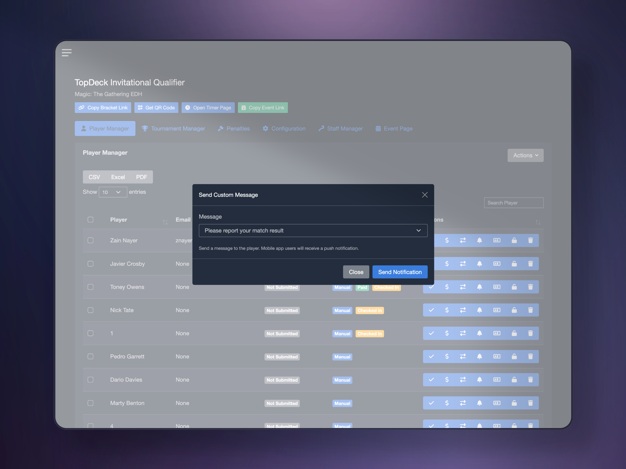 Allows you to send a push notification to a player via the app. The player will receive a notification on the mobile app, as well as their inbox on the TopDeck.gg website.