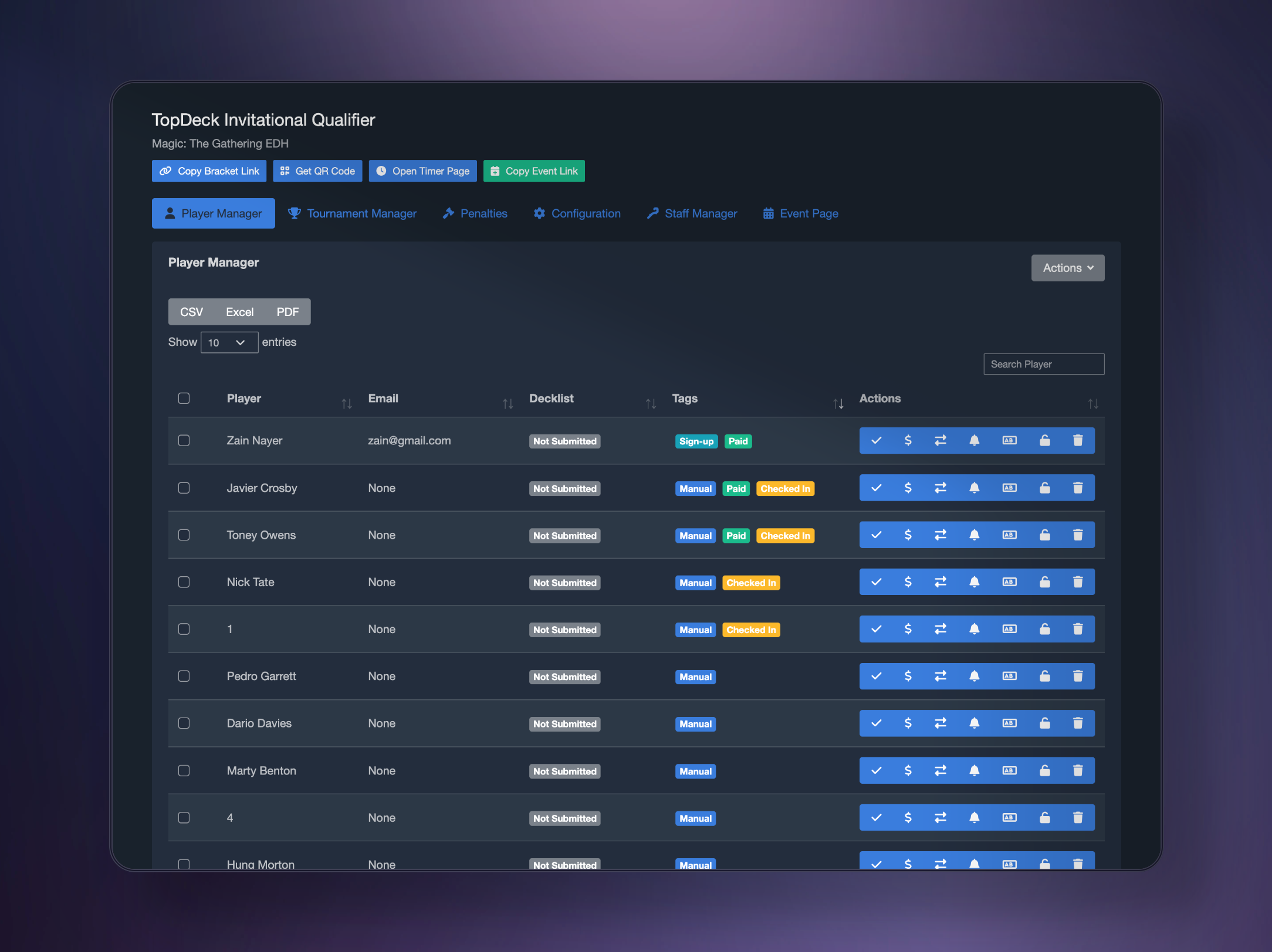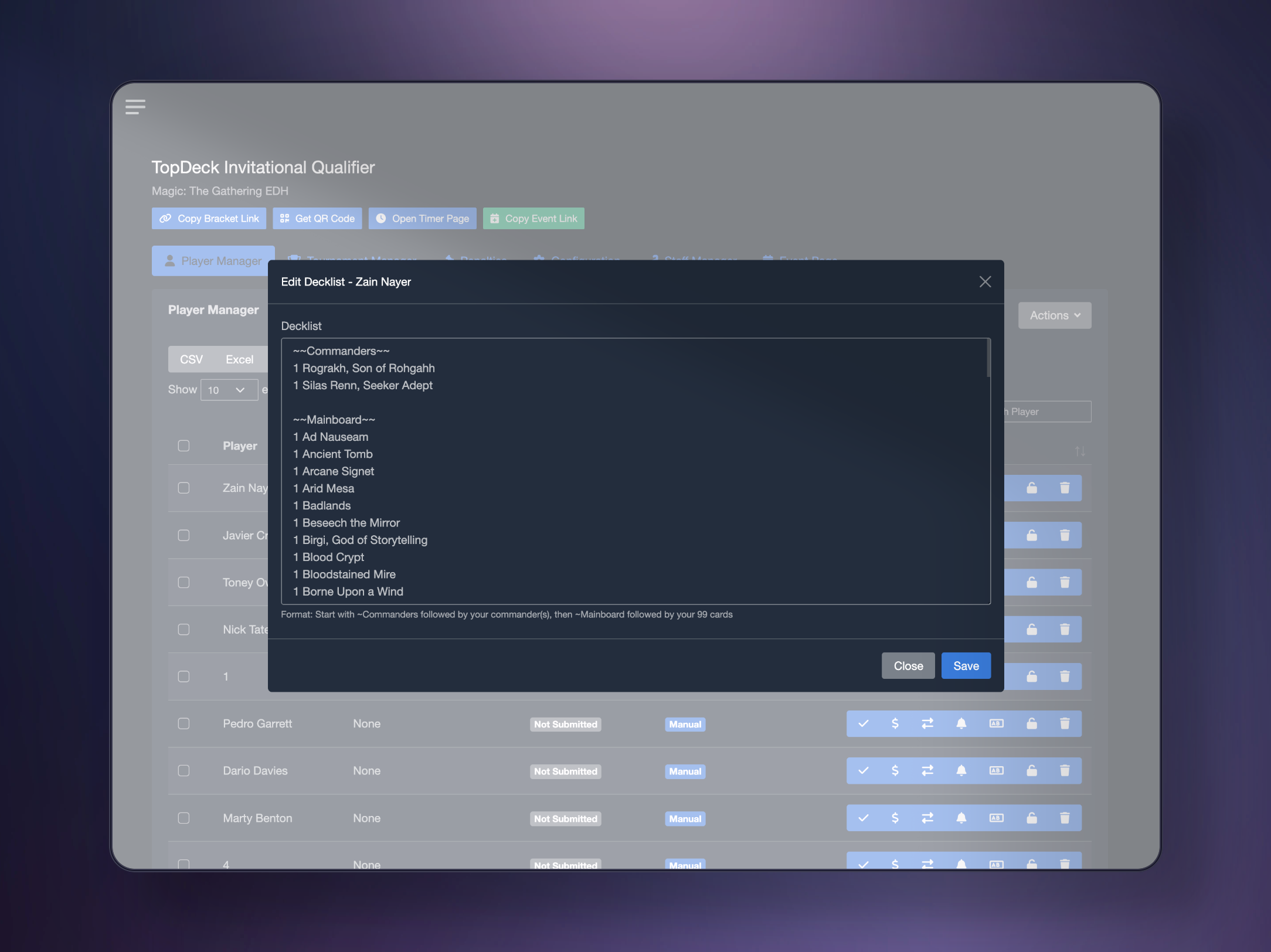 The TopDeck.gg tournament software gives you powerful abilities to manage player registration exactly how you want. You'll be able to check in players, mark them as paid, change decklists, remove players, and more. In this article, we'll go over registration management and waitlists.