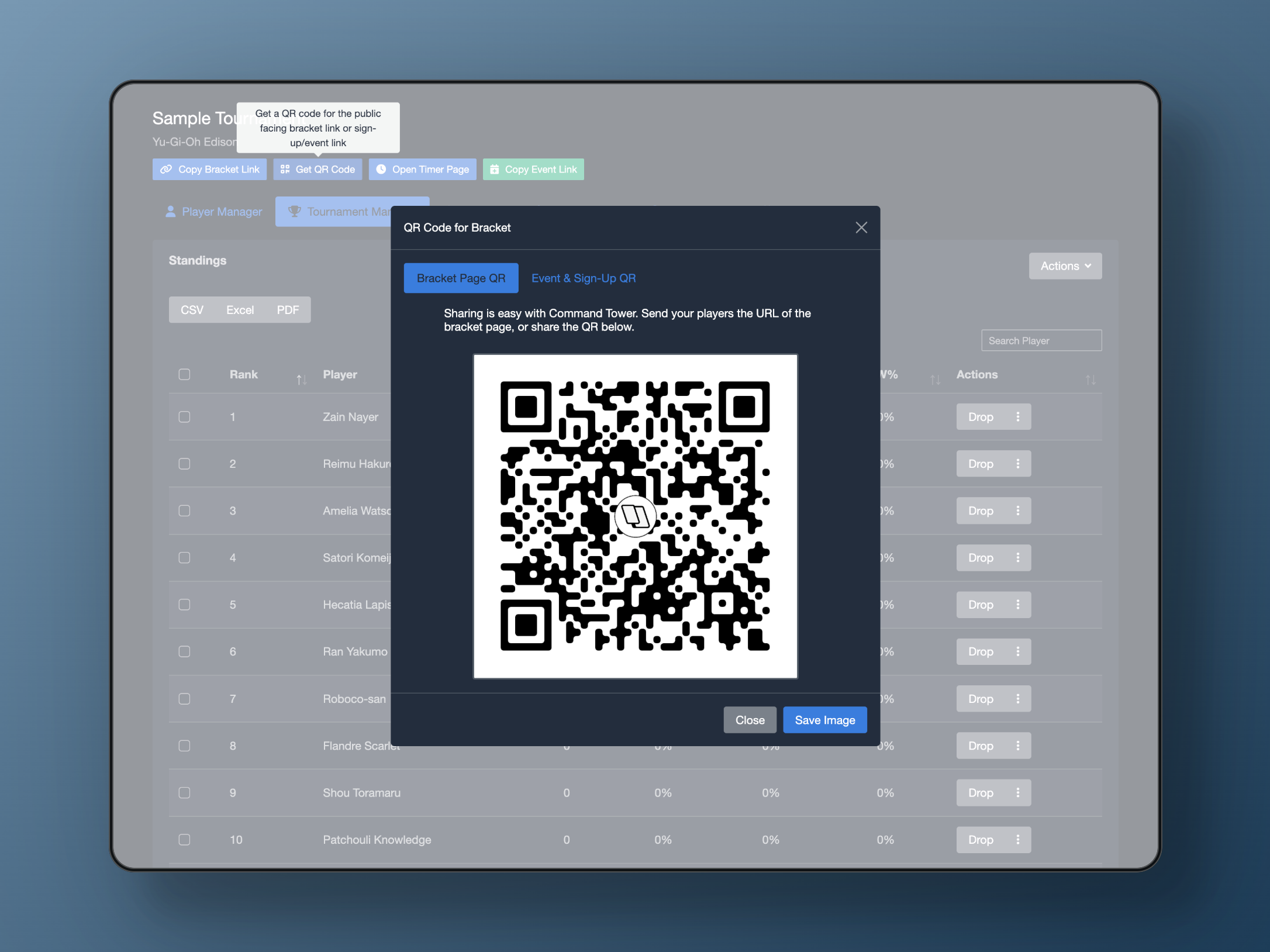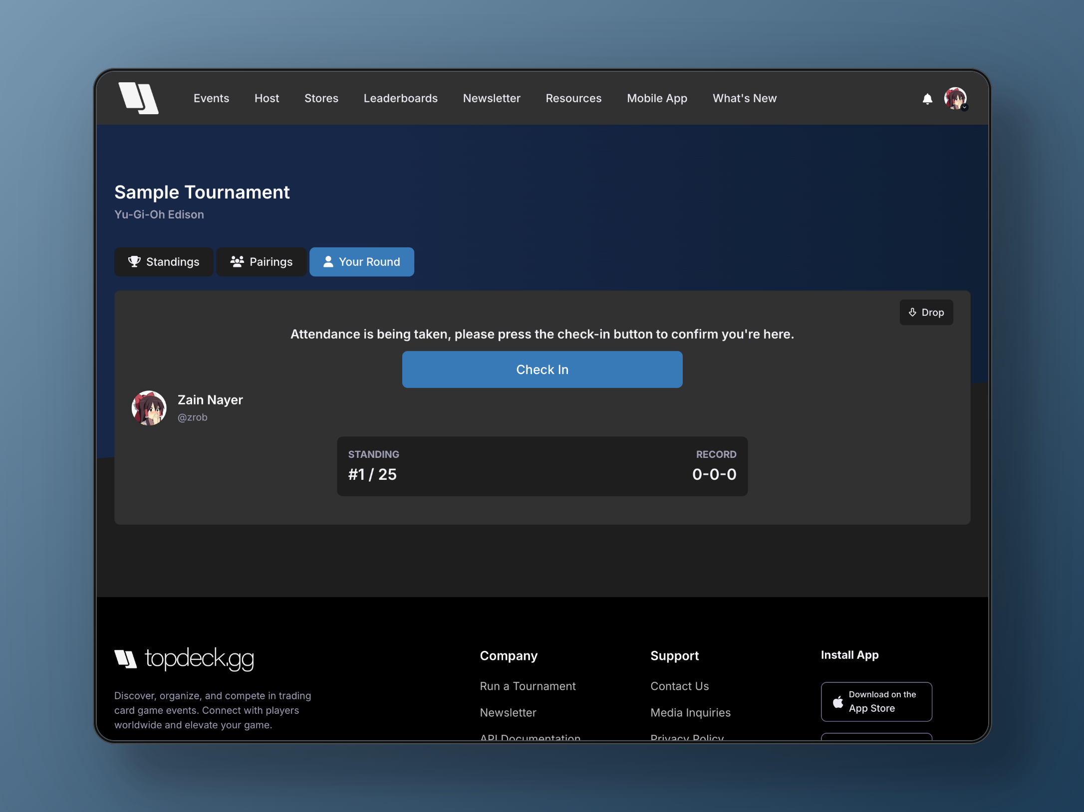 The bracket page is where players can find all public standings, pairings, and access things like self-reporting. These features are also accessible via the Mobile App.