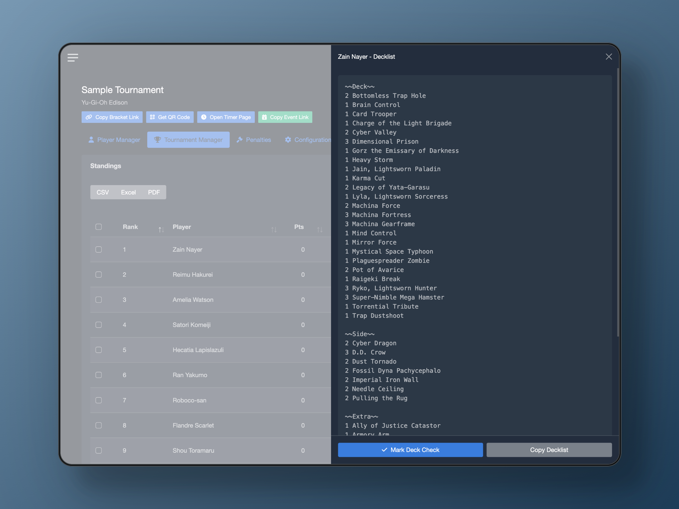 The Standings Manager is where you can manage your players during the tournament. From here, you can drop players, add penalties, mark deck checks, assign game losses or byes, and view decklists.