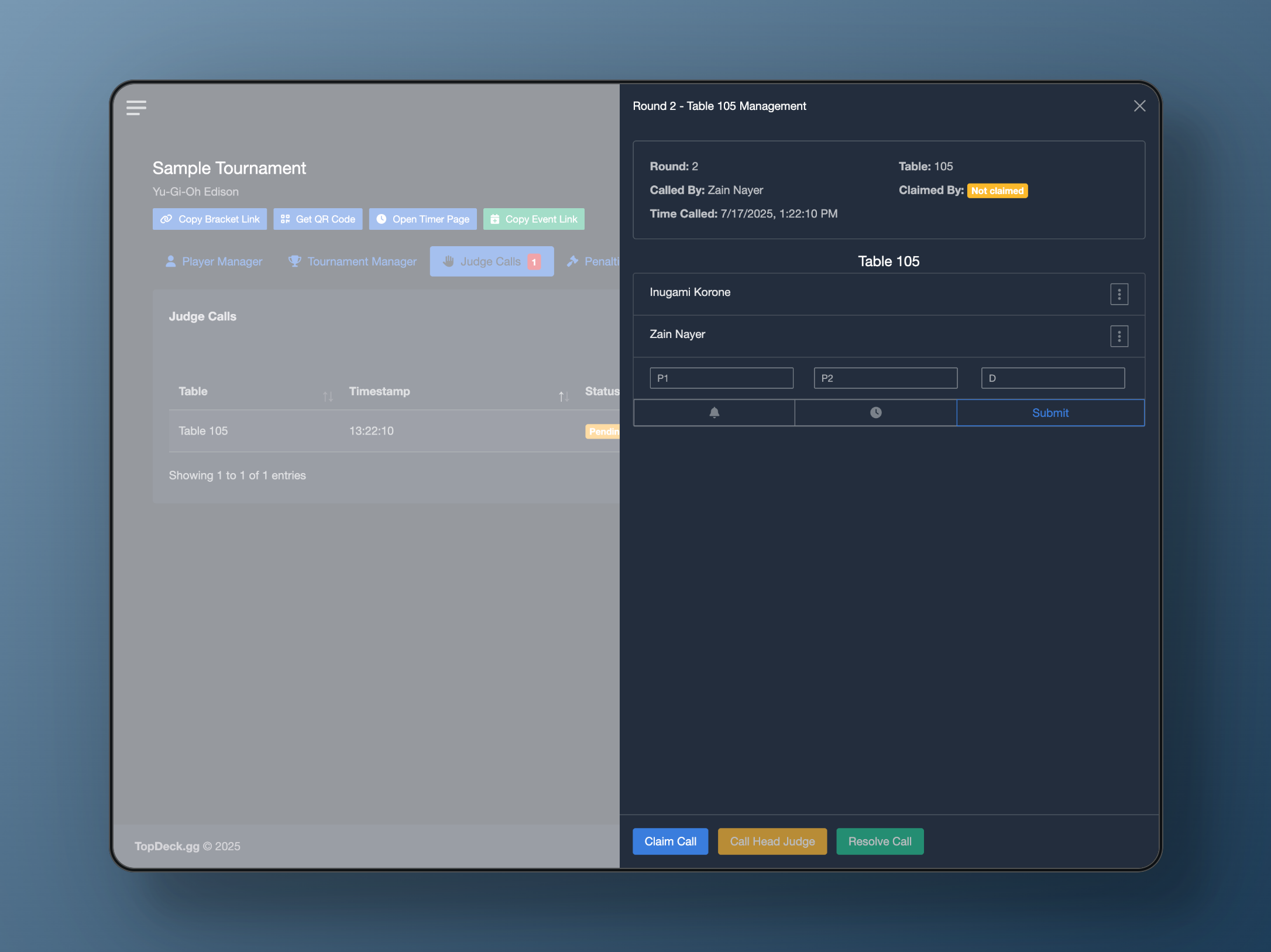 If this option is enabled, all staff on the tournament will have access to the Judge Calls tab. Additionally, players will be able to call a judge from the bracket page or mobile app.