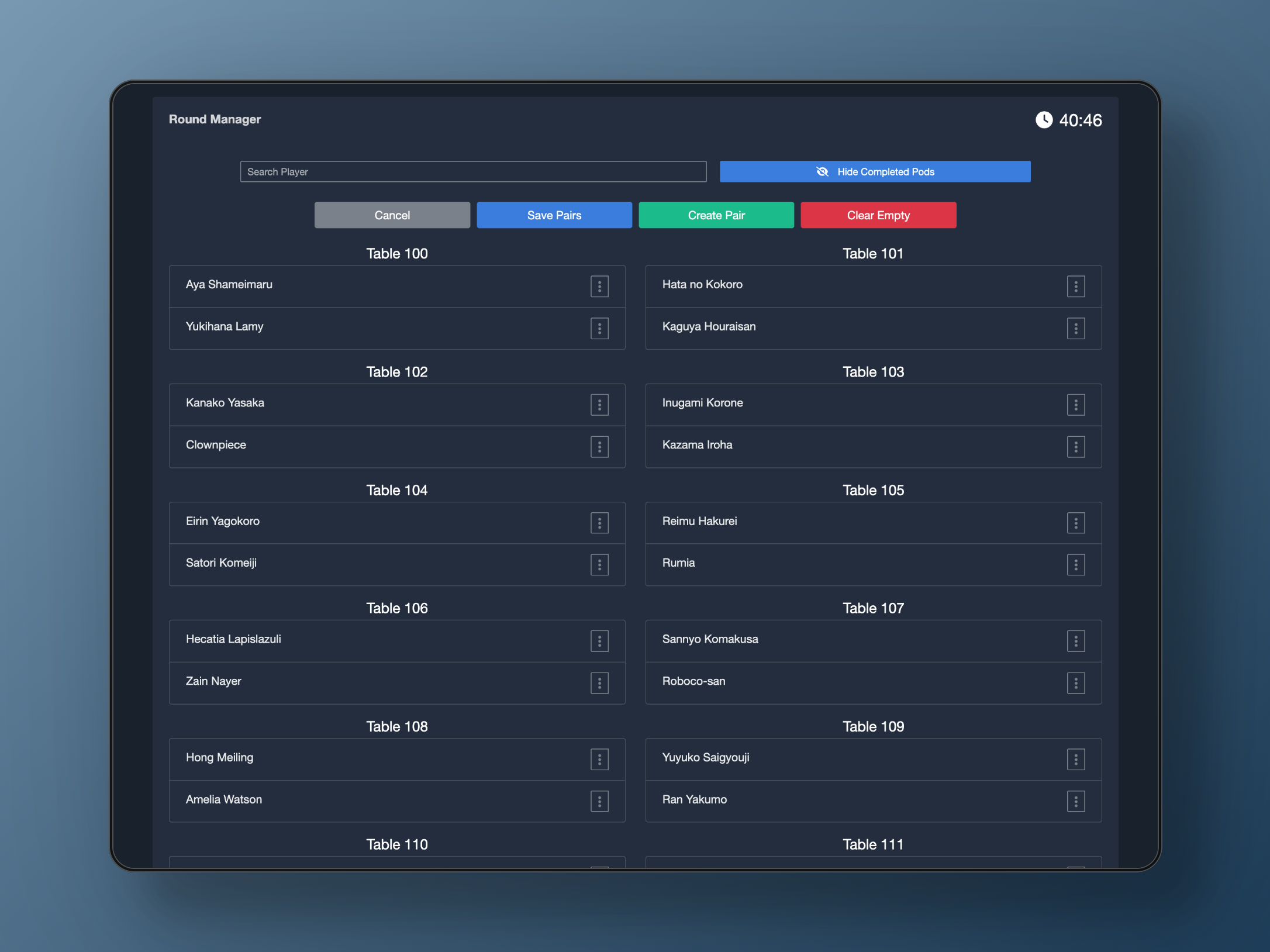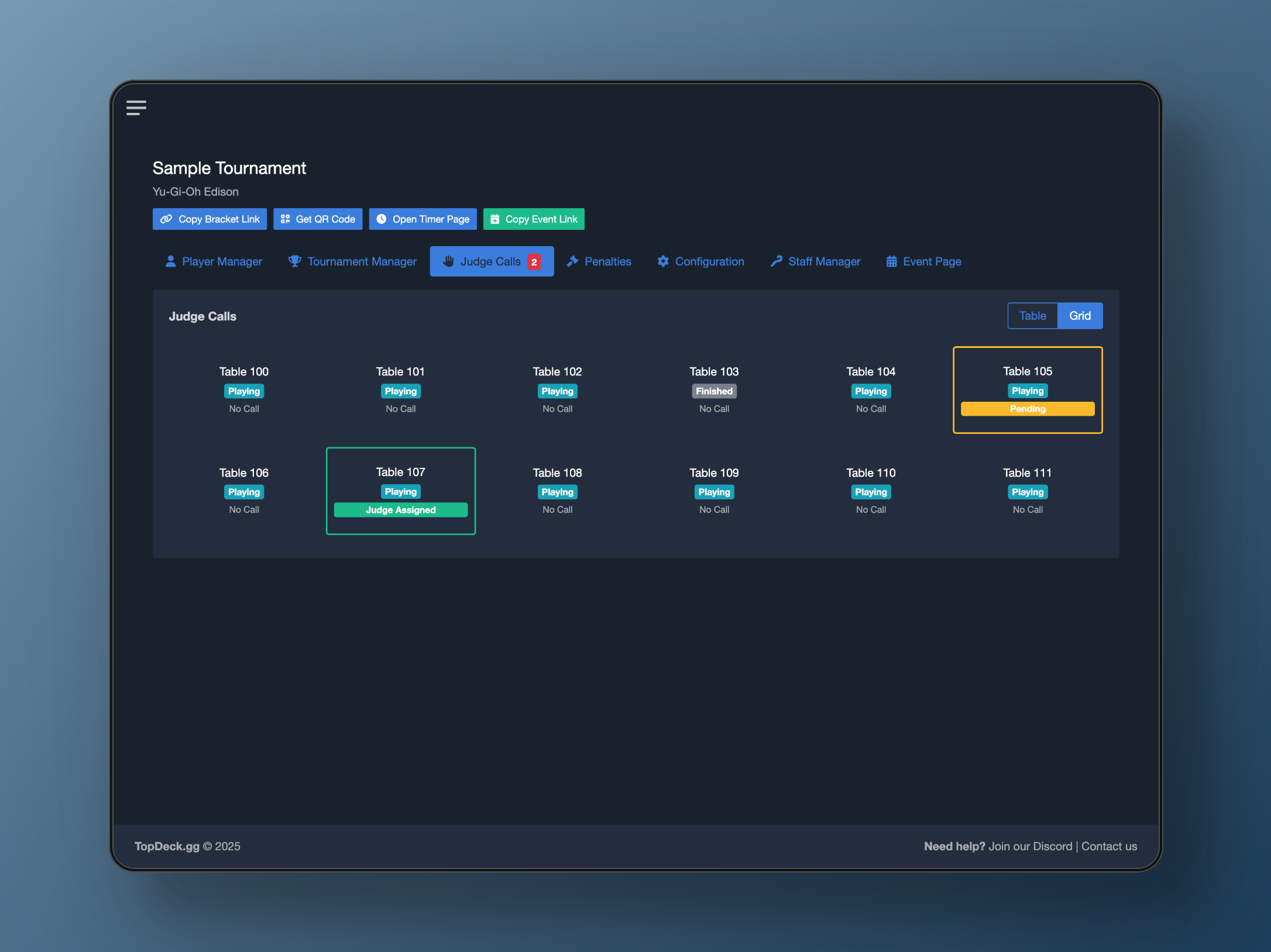 Finally, you can view all tables in the tournament and their status in a single grid. Clicking a table will bring up the potential judge call or allow you to create one so others know you are at the table.