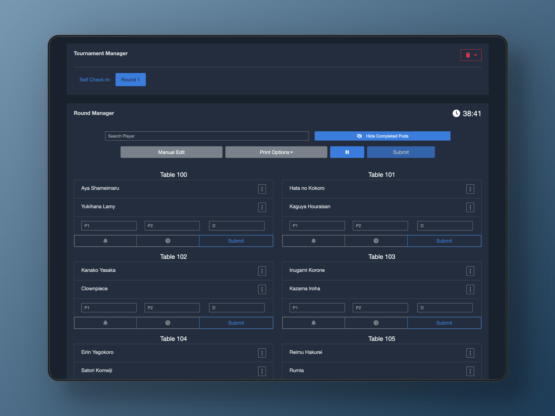 Once all results are submitted, you can hit Submit on the round manager to finalize the round. Standings will update automatically.