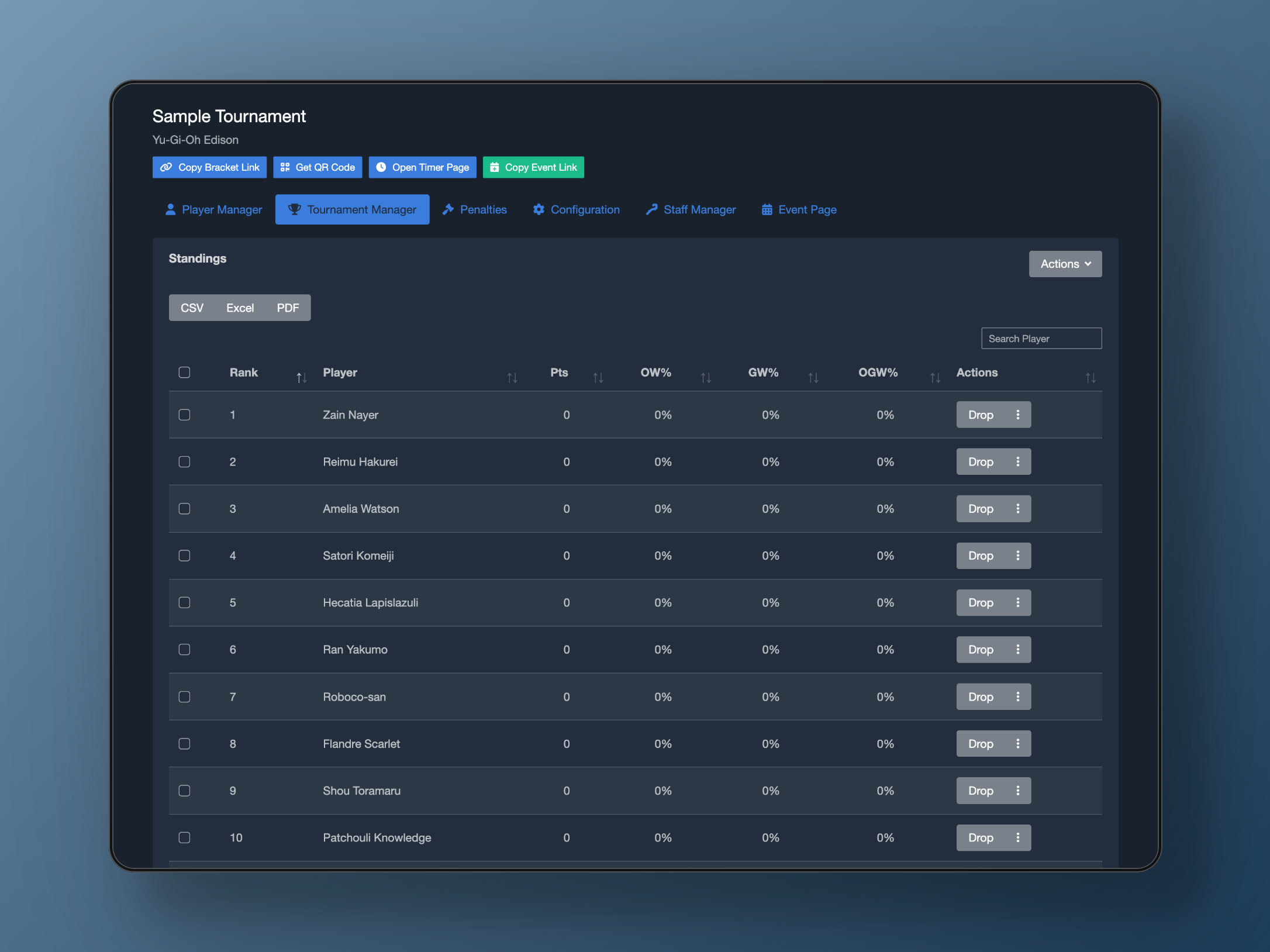 Additionally, you can export the standings table as a CSV, Excel file, or PDF as well. The Standings will show each player's rank, name, and any tiebreakers you set in the configuration.