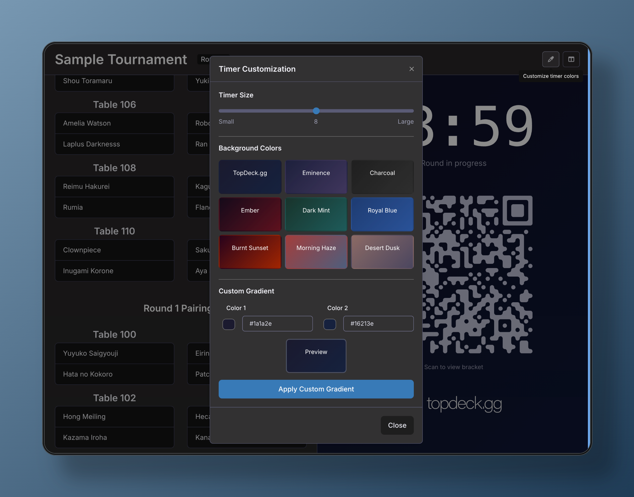 The Timer page displays the time remaining in the current round, as well as a scrolling view of the pods in the round. Tournament organizers can use this page to display the time and pods on a large screen or projector for players to easily see. The page also includes a QR code that links directly to the tournament bracket page.